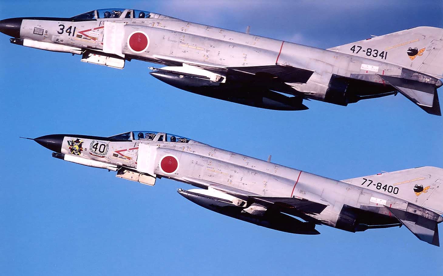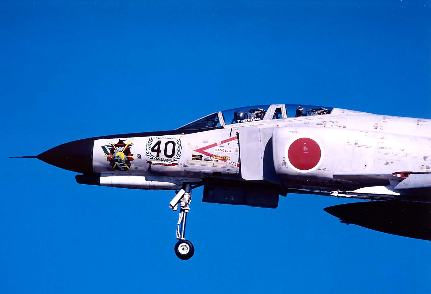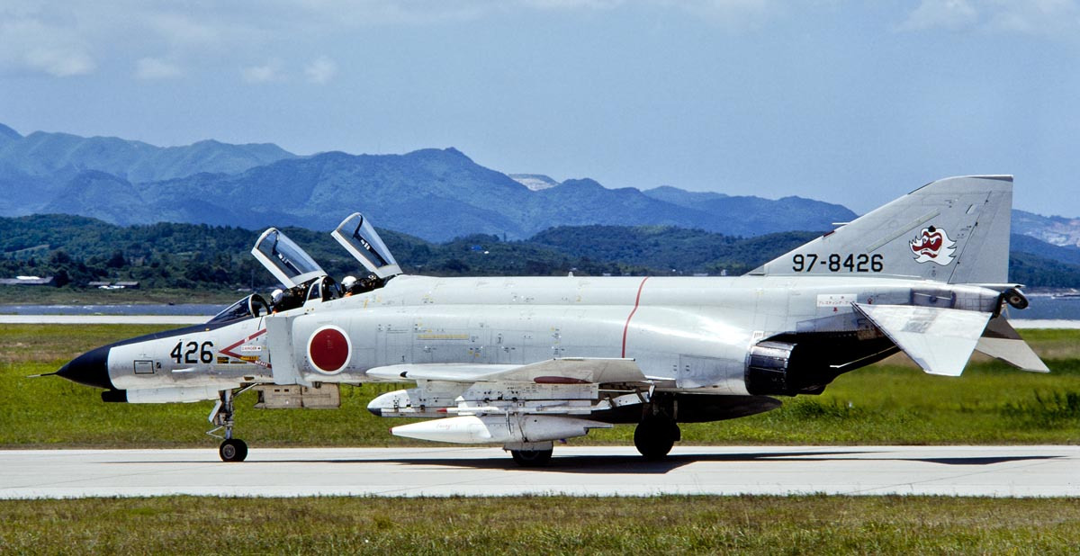 An illustration commemorating the 40th anniversary of the opening of Nyutabaru Air Base was painted on the nose. The serial number of No. 400 was changed to 40 and surrounded by a laurel wreath, and the amusing illustration shows the F4 mascot, Spook, emitting the word “Kamehameha.” “Kamehameha” is an energy blast fired by the main character of the popular Japanese anime “Dragon Ball.” This photo was taken at Nyutabaru Air Base on December 10, 1997.