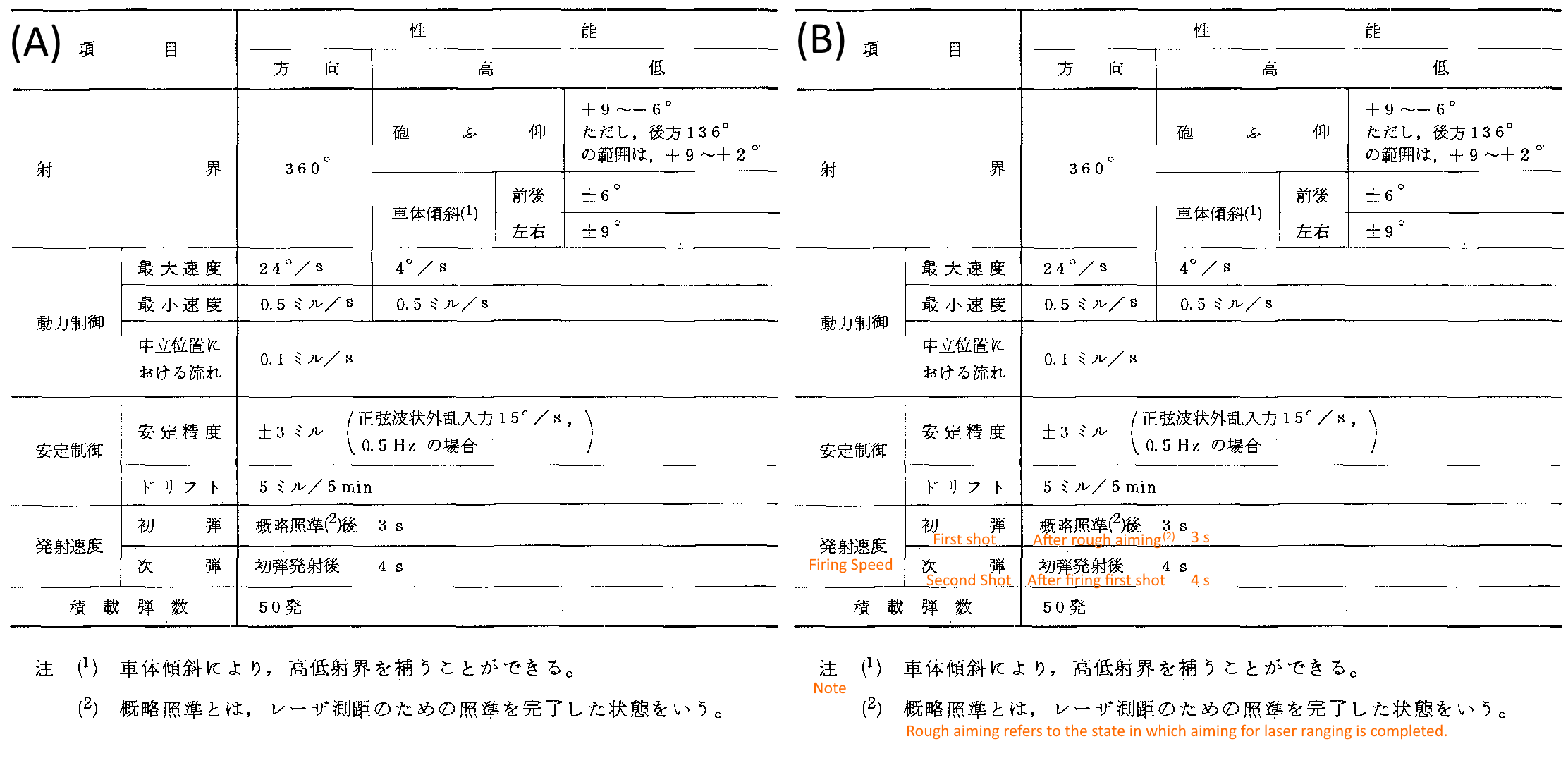 According to the specifications, the horizontal traverse range in which the maximum gun depression of –6° is available appears to be narrower than in the current in-game model.