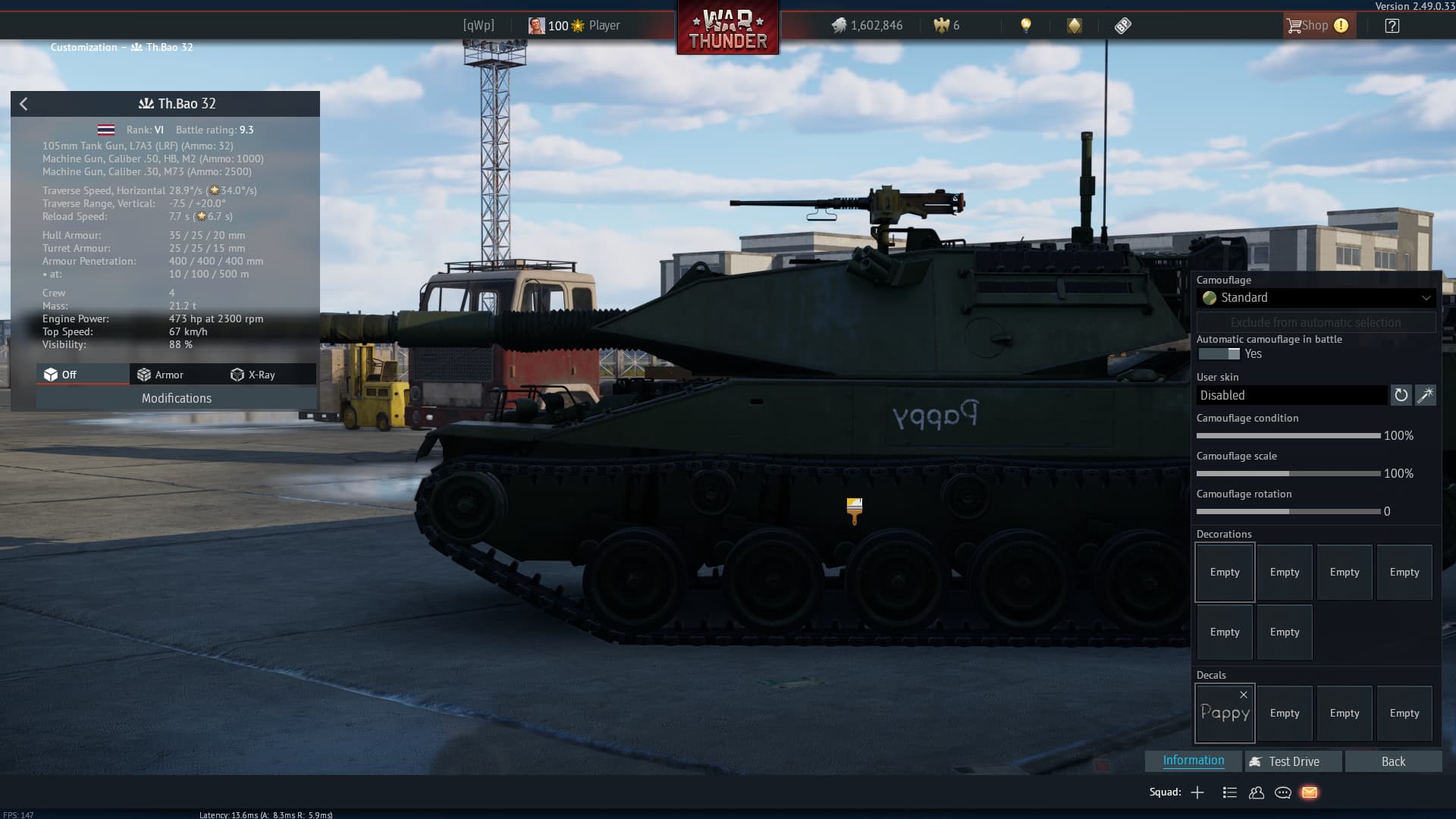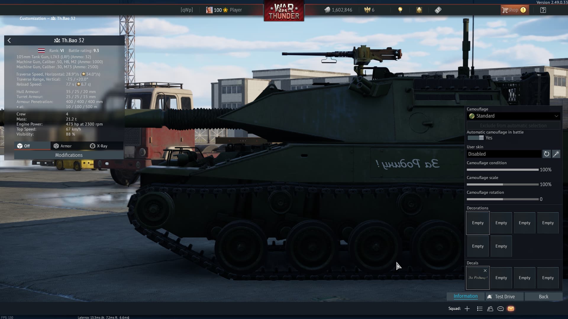 Not sure to be honest? The Olifant Mk.2 is 9.3 and the M60A3 TIFCS would be “worse” in that there’d be no engine upgrade nor armour improvements, but it would be better than the TTS… Another point for a decompression ig?
