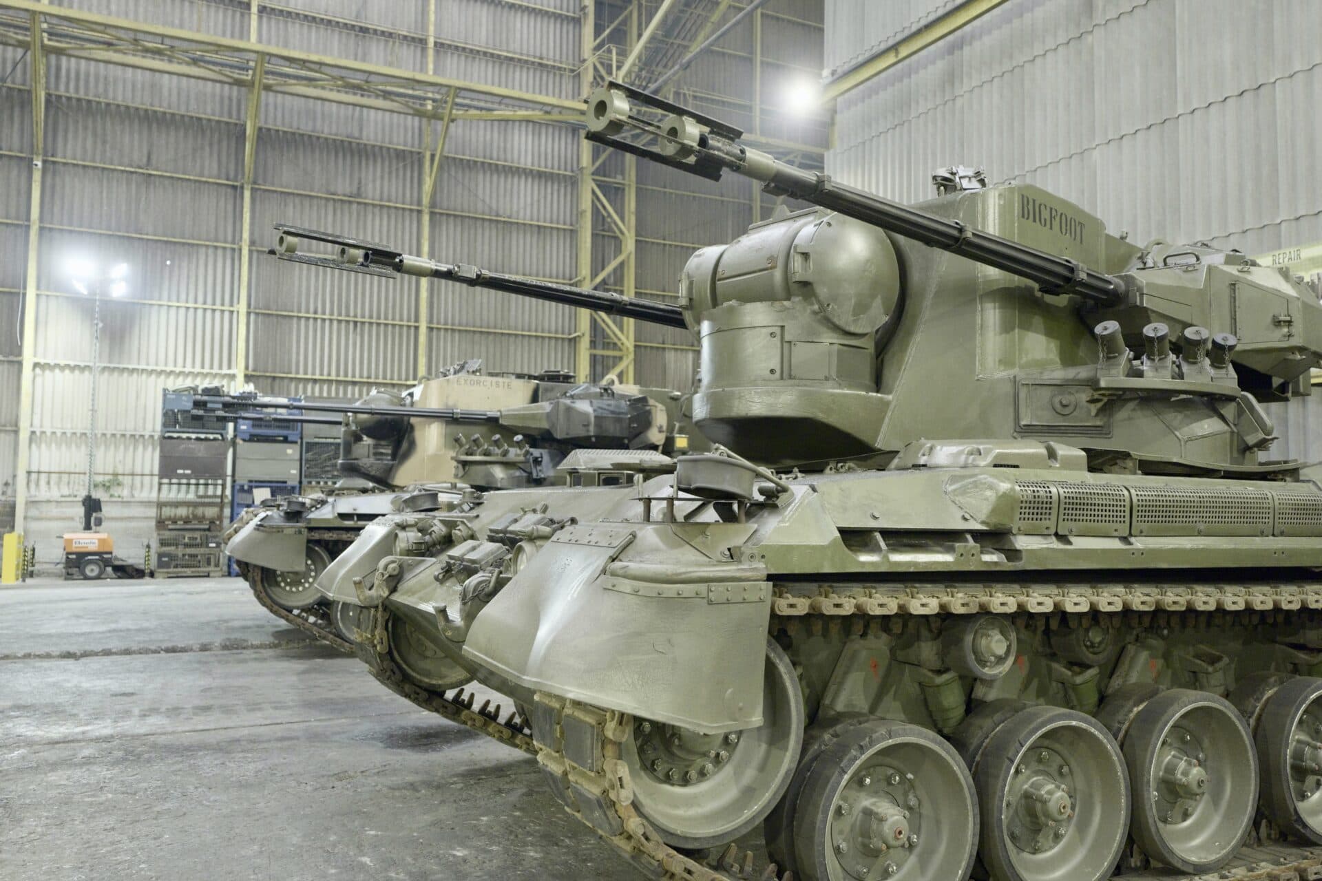 Belgian B2LV Gepard ‘Bigfoot’ in an IOP warehouse with the Belgian markings.