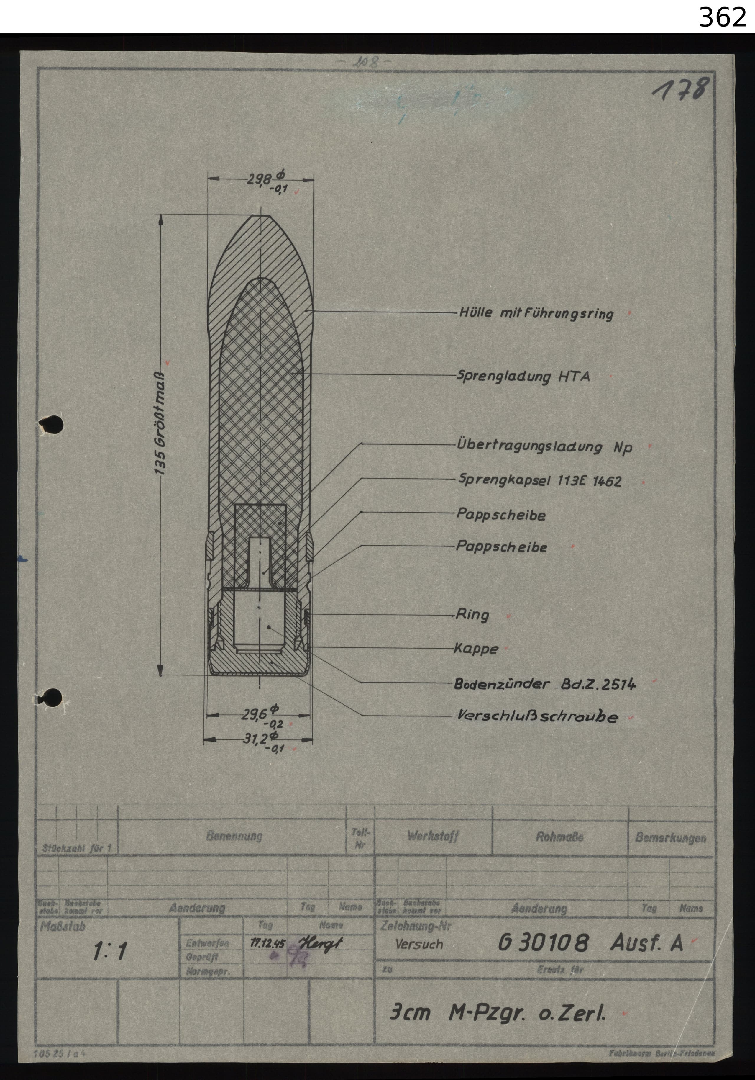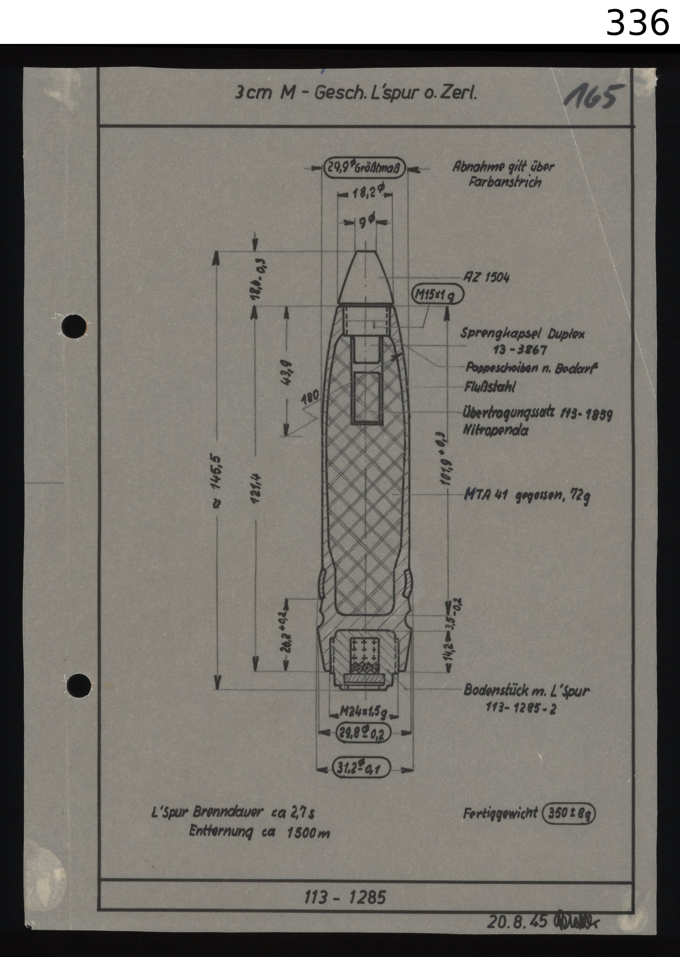 Brgr. o.L'Spur o.Zerl (I) 0,33kg 900m/s 140g Incendary mix & 0,6g Pent (1,02g)