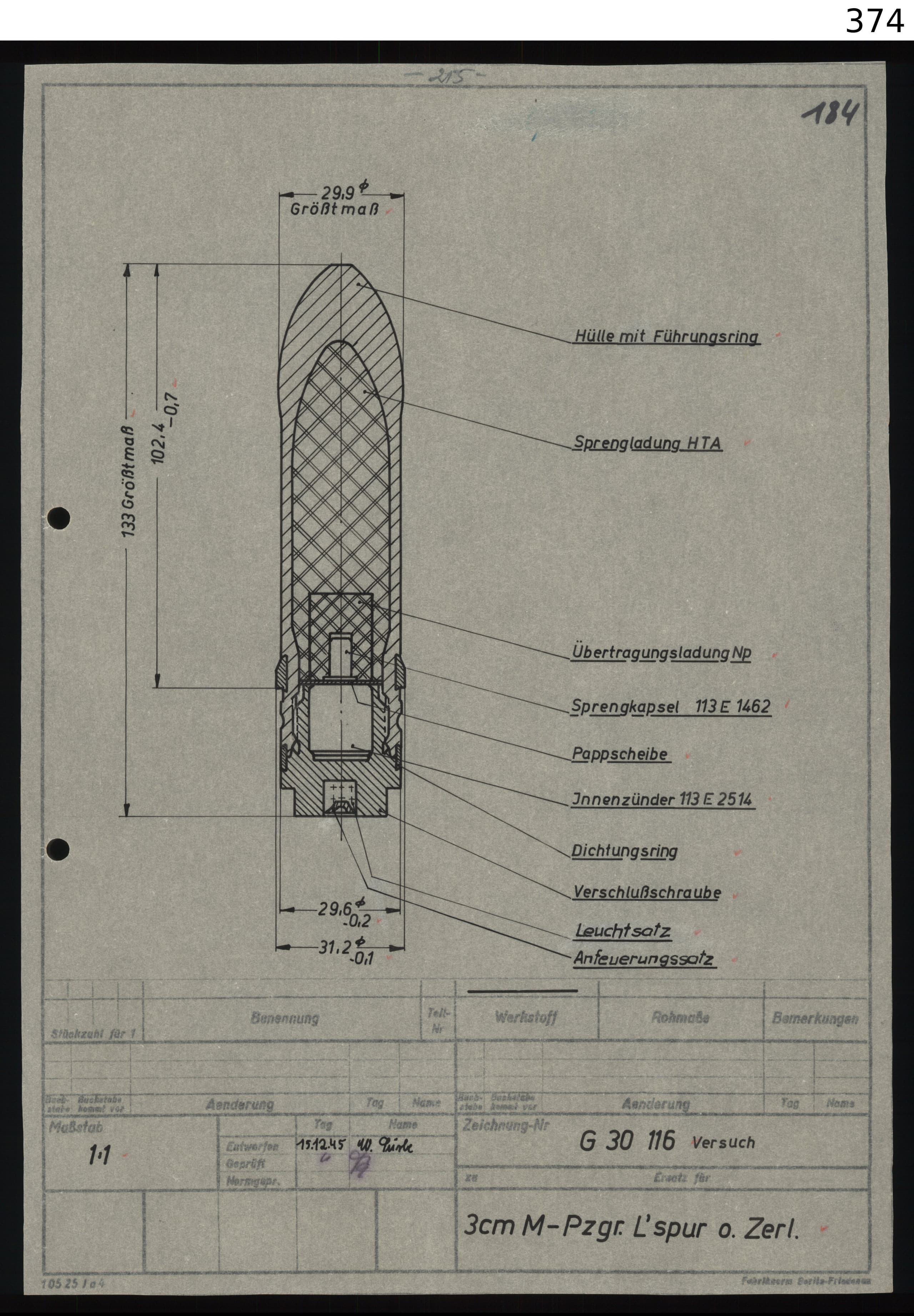 Pzsprgr. L'Spur m.Zerl. (Aphe-T Sd) 0,120-122 kg 900/920m/s 3,5g Pent (5,95g TnTa) 32,80-33,85mm/10m