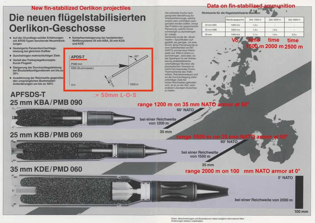 Here the brochure lists a penetration of 25mm RHA at 1000m, 60° NATO for 25mm APDS-T (KBA)