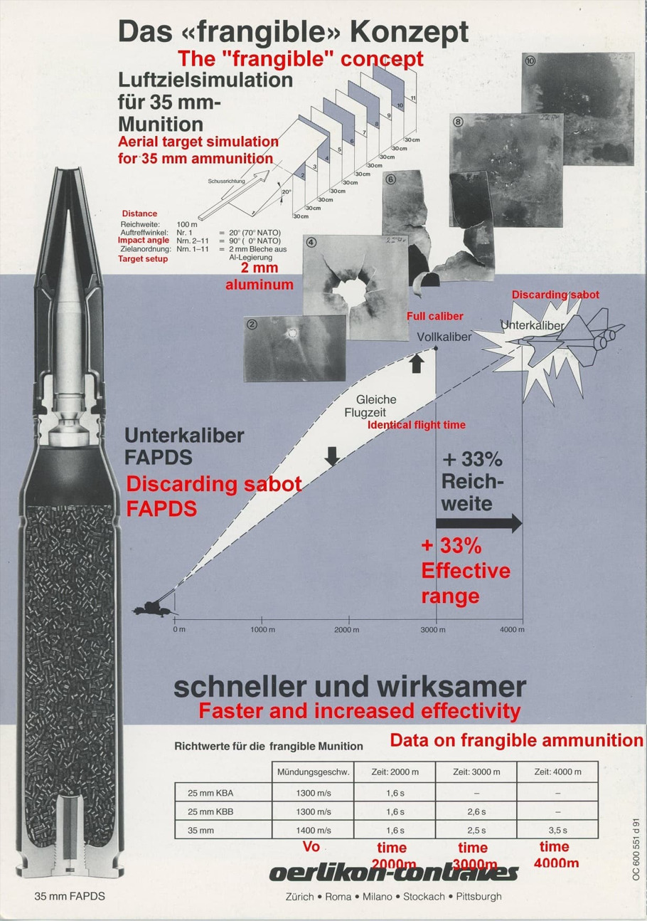 ^This page of the “Oerlikon sub-calibre ammunitions” brochure focuses on FAPDS’ effect on aircraft (which feature airframes/platings of light alloy metals, such as avional) and how, despite of FAPDS being a sub-calibre AP round, it still has significant effects, even inside a lightly armoured target. (which APDS e.g. doesnt - its’ effect is much more localized)