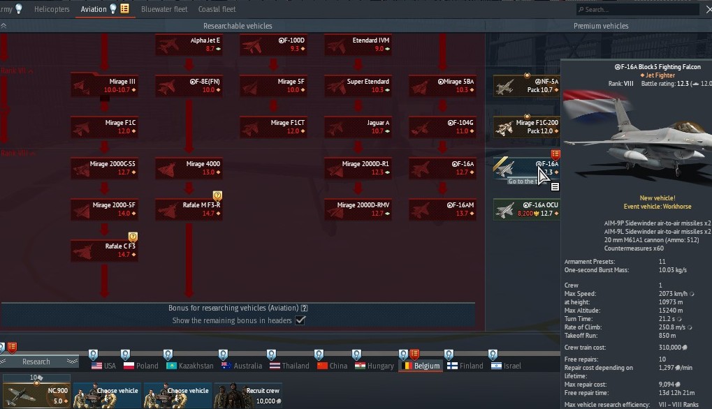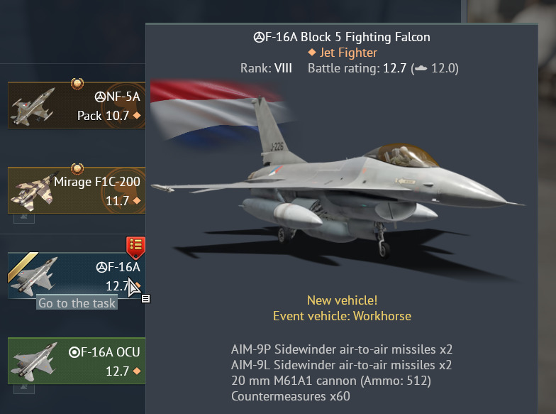 I have access to the free tree Belgium F-16A. I noted the difference in BR and in Sidewinder M/P.