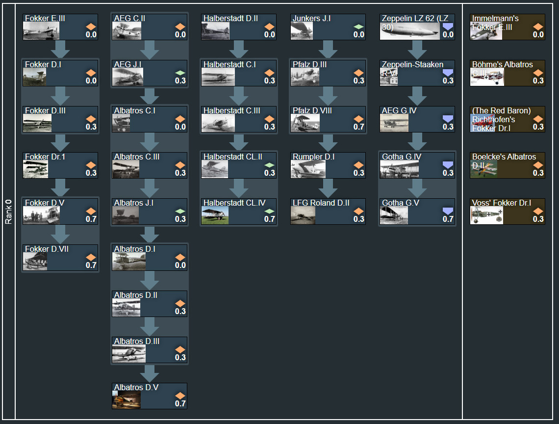 Similar to idea 1, this would have the addition of Rank 0 below the current start of the tech tree. It would be placed below reserve aircraft and be optional for players to research and play. It would have battle ratings from 0.0-0.7. I think this would be the most promising personally as again it would be completely optional as some players may not be interested in this era of aircraft. However a problem this would have is the battle ratings would be quite compressed as these aircraft would be limited to a 0.0-0.7 BR range as they are simply leagues behind even the worse reserve aircraft in-game.