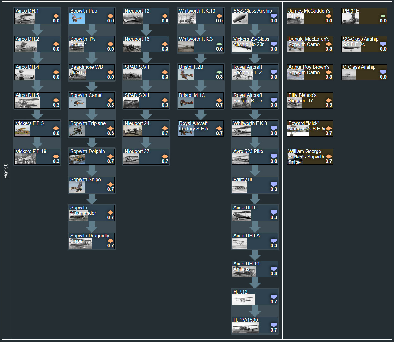 Similar to idea 1, this would have the addition of Rank 0 below the current start of the tech tree. It would be placed below reserve aircraft and be optional for players to research and play. It would have battle ratings from 0.0-0.7. I think this would be the most promising personally as again it would be completely optional as some players may not be interested in this era of aircraft. However a problem this would have is the battle ratings would be quite compressed as these aircraft would be limited to a 0.0-0.7 BR range as they are simply leagues behind even the worse reserve aircraft in-game.