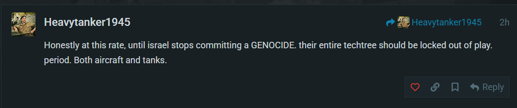 You’re getting your own conclusions, @Heavytanker1945 never expressed any hate torwards Israel as War Thunder content anytime in this thread, matter of fact Israeli tech tree was considered a bad addition four years ago, when the tech tree was announced, this Reddit post shares this same concerns. Israeli tech tree itself is not the reason why the game lacks older technology from prior conflits like World War Two and so on but I have no doubt that better potential additions could’ve been considered.