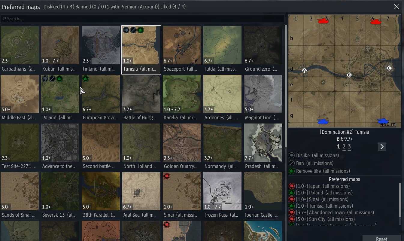 I truly love Domination #2/Battle #2 Tunisia. It’s around 3.3km x 3.3km for modern tanks and enough room for SAM systems to position myself with. Prefer 4km x 4km + maps. The main reason I like that map. I dislike the smaller versions of it though, wish I can dislike/ban all the tiny 1.5km size maps for top tier but low to mid tier is fine.