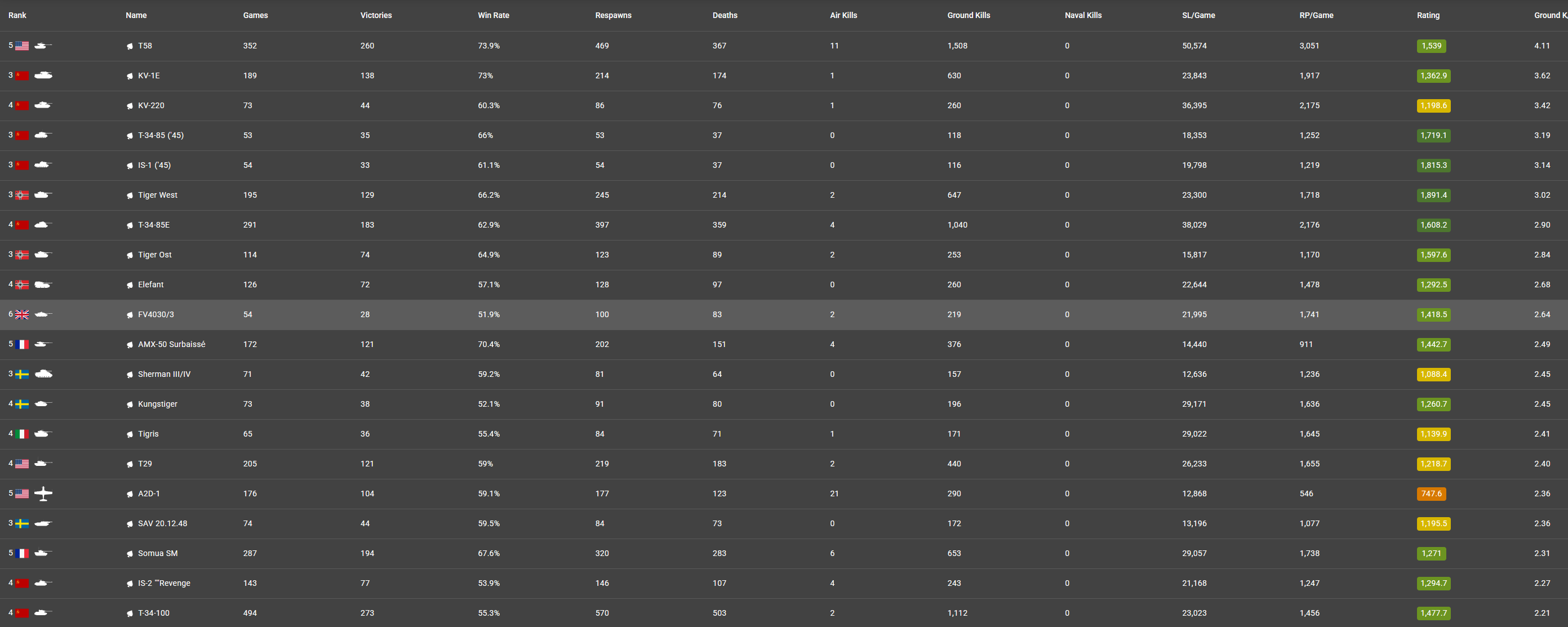 Suprise was T58 where you have like 4.1 K/D and actually a lot of games compared to others… but i guess abusing the busted vehicle of the time is what you do… but T29, T29E5, T34 those are the evil ones that needs to go up because your Surbaissé failed to pen it… sure…