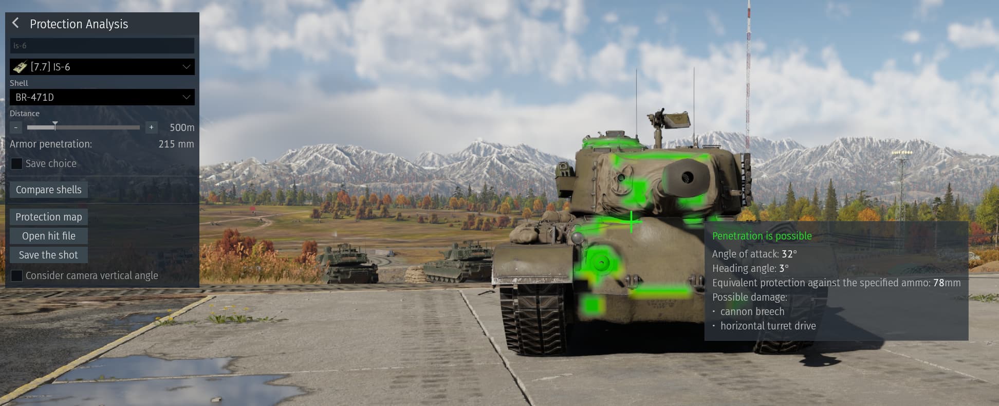 lets show the sides then in simmilar angle you actually might see some green areas on the IS6… if i remember correctly then below the sideskirts at almost perfect 90 degree angle but not too low only thin strip because then its angled under it and bounces to the ground…also need to avoid the wheels and wheel mounts they eat shots.