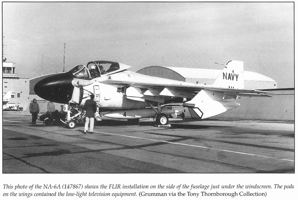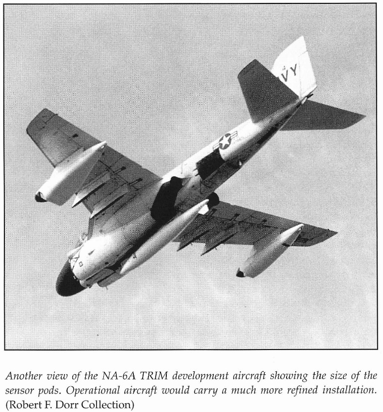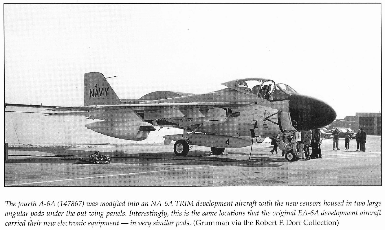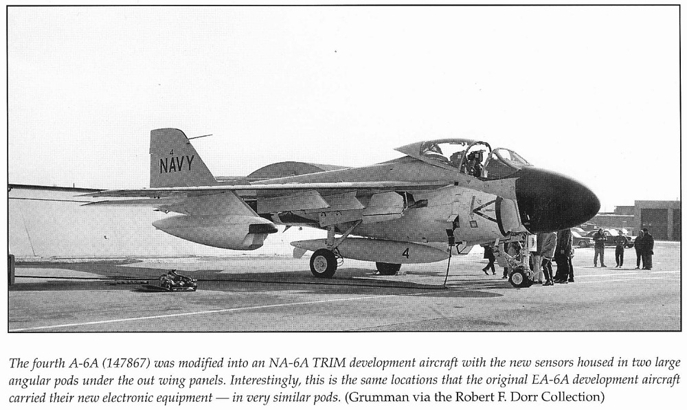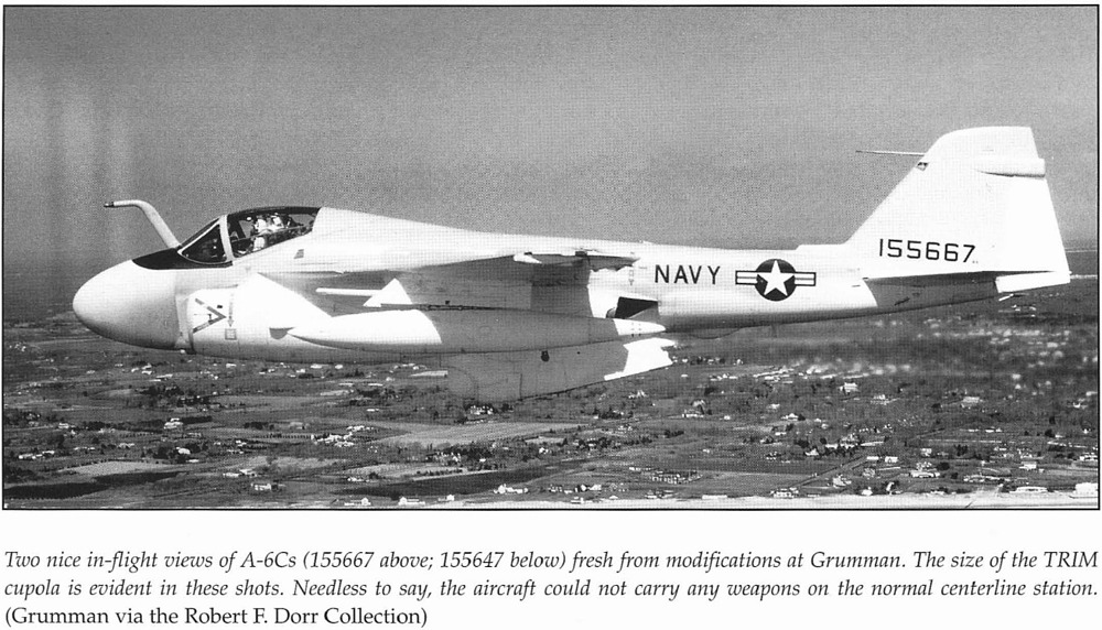 Initial TRIM testing began in 1967, with the system mounted on modified AP-2B Neptune aircraft operating out of Cam Ranh Bay, South Vietnam, from September 1968 to June 1969. This combat evaluation phase provided valuable feedback to Grumman. One of the first dedicated test platforms was a modified NA-6A (BuNo 147867). Early versions of TRIM used angular wing-mounted pods, but these were replaced with a more refined, removable centerline pod with a rotating turret. Due to the added weight of the system, the A-6C was retrofitted with the stronger tail hook assembly from the EA-6A to accommodate higher landing weights. The first flight of the TRIM-equipped testbed occurred on June 11, 1969.