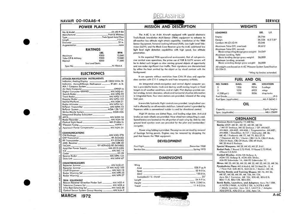 Several other squadrons, including VA-34 Blue Blasters, VA-75 Sunday Punchers, and VA-176 Thunderbolts, also operated the A-6C while it was in service. The variant remained in frontline use until late 1975. After its retirement, the remaining eleven A-6Cs were upgraded to the latest strike configuration—either at Navy rework facilities or at Grumman’s plant on Long Island. Most A-6Cs were ultimately converted into A-6Es following the end of the Vietnam War.