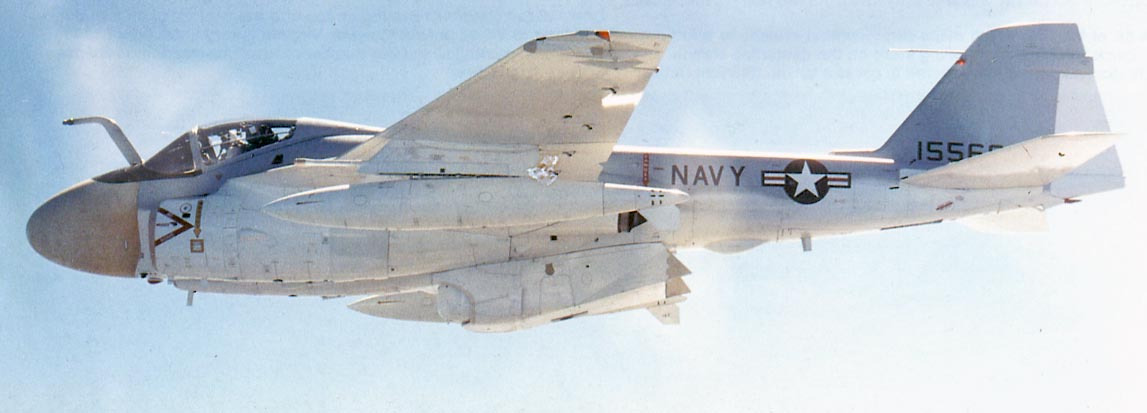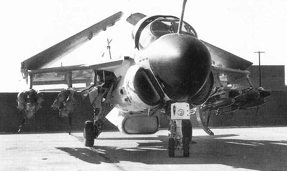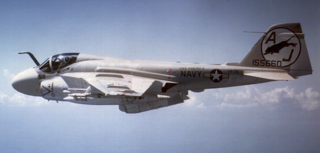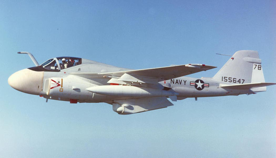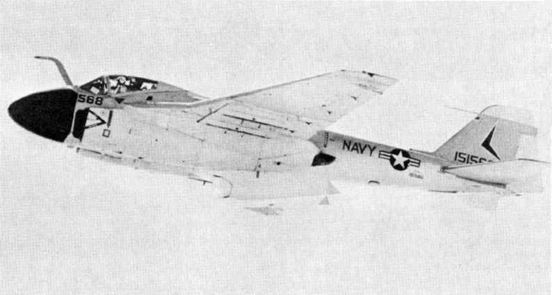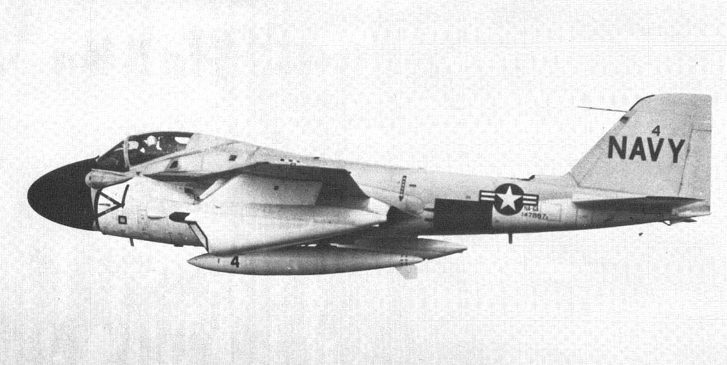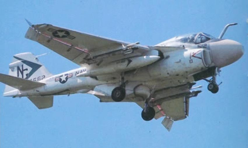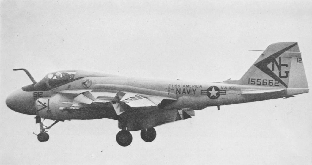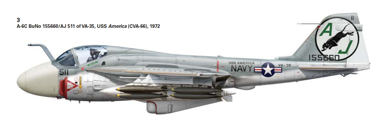 VA-35 also operated the A-6C aboard America from 1972 to 1973. The squadron developed a tactic using the A-6C as a stabilized laser designator platform: after identifying a target via radar or FLIR, the A-6C’s crew would illuminate it with a laser, guiding precision strikes by a second A-6 carrying Texas Instruments Mk 82 Paveway laser-guided bombs.