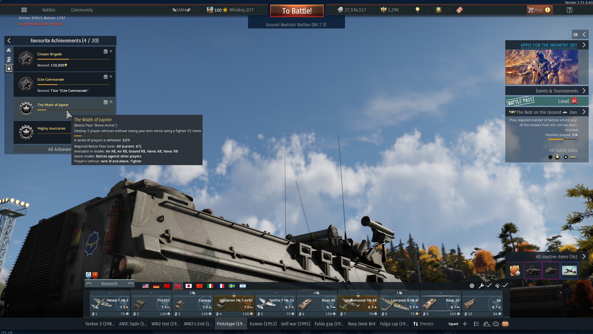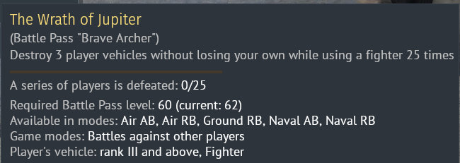 To complete the Battle Pass challenge “The Wrath of Jupiter,” you must repeatedly achieve a streak of three kills on player vehicles without your own aircraft being destroyed. This process must be successfully repeated a total of 25 times (0/25 progress). You must use a Fighter of Rank III or above in any permitted player-versus-player modes (Air AB/RB, Ground RB, Naval AB/RB). A common strategy is to use a capable Rank III+ Fighter in Ground Realistic Battles (Ground RB) to quickly destroy three enemy ground vehicles (tanks) before being shot down, as this often leads to faster progression than solely engaging in dogfights in Air RB.