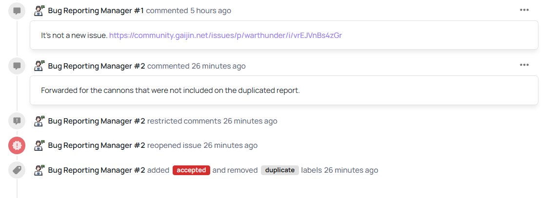 Closing the report as duplicate before it was even Accepted / Forwarded makes me think that the DEV didn’t even receive or read the report. They linked a 2 year old report too to justify the duplicate… however the guns were already fixed countless times in that period of time (and broke again as well).