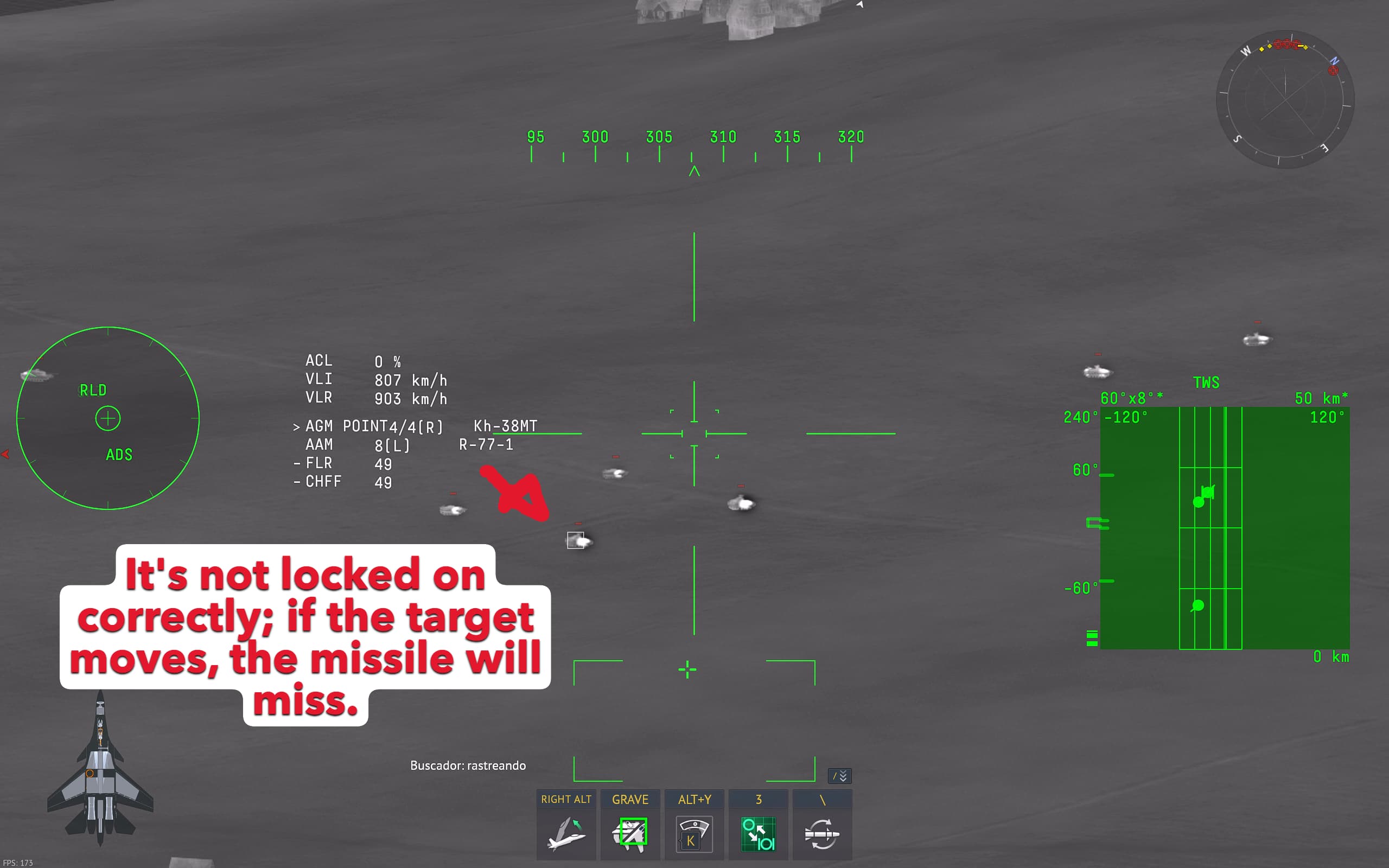 I have an extremely annoying problem: I can’t lock onto my Kh-38 MT or any other IR- or TV-guided missile or AGM. I’ve tried everything and I’m really desperate now. Take a look at the photos. The first two show what the lock looks like every time I press the space bar. Only this square □ appears, so if the target moves, the missile will miss. The correct thing would be to get the symbol in the last photo [-□-] but with the Kh 38MT I’m only getting the correct lock in the last photo, below 8km away, whereas I see gameplays on YouTube with guys getting this lock at almost 20km away. SOMEONE HELP ME FOR THE LOVE OF GOD!!!
