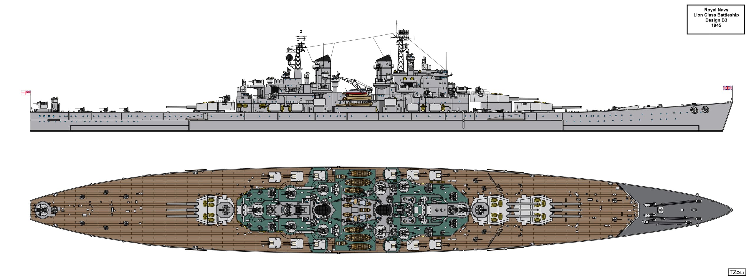 Some of you might be wondering why later designs weren’t included in this suggestion. Here is my reasoning.The construction work on both HMS Lion and HMS Temeraire started in mid 1939—on the 4th of July and 1st of June, respectively. Work on the original hulls had been ongoing until the suspension of both later in October of 1939; and after resuming, again in May 1940, which lasted until the project was canceled altogether and first parts began to be scrapped in April 1943. Designs beyond that point in time were not made specifically for the existing hulls, and were made purely for the potential resurrection of the idea and envisioned the entirely new Lion class for the post-war Royal Navy. Therefore, designs and proposals made after 1943 are not considered in this suggestion.