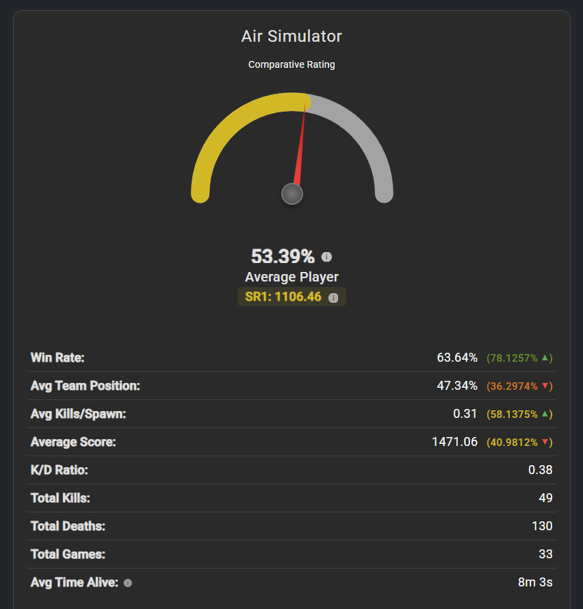This is the case for many top tier aircraft at the moment, in part its a compression issue, but ultimately its bad gamemode design. But this isnt a case of “US underperforming” as the same can be said for many. I fly the Typhoon and I tend to play defensively early game, and then aggressively mid to late game and perform fine.