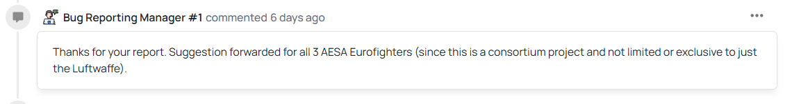 Someone made a bug report that the German Eurofighter should have the AMK (Aerodynamic Modification Kit) which basically just makes it a lot more manoeuvrable and it got accepted but the bug report moderators said they will accept it for all 3 EASA Eurofighters eventhough its just germany that has this modification they said it will go to all 3 because its a “consortium project” but why did the Germany Eurofighter not get the same EASA radar as the British and Italian ones if its a “consortium project” and they should all get the same modifications according to the bug report mods?
