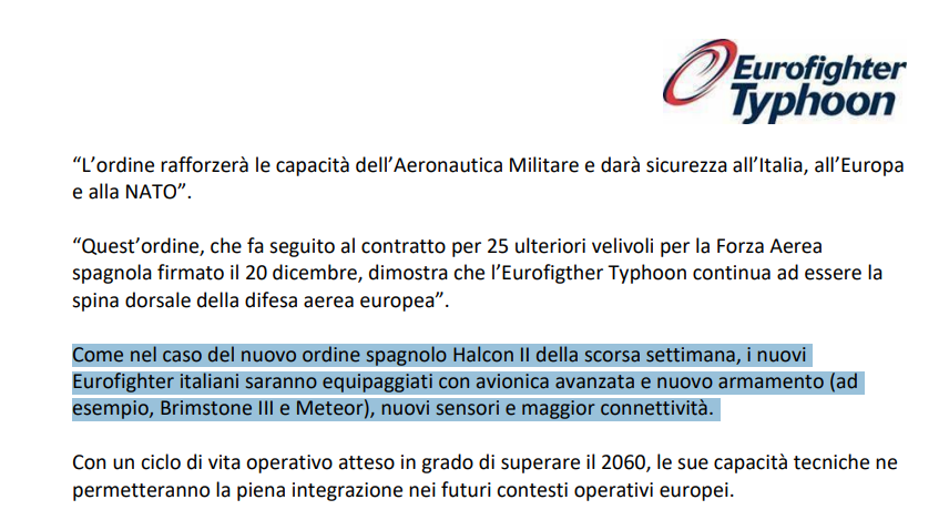 The highlighted line translates to: As per the new Spanish Halcon II order of last week, the new Italian Eurofighters will be equipped with advanced avionics and new weapons (such as, Brimstone III and Meteor), new sensors and improved connectivity/link.