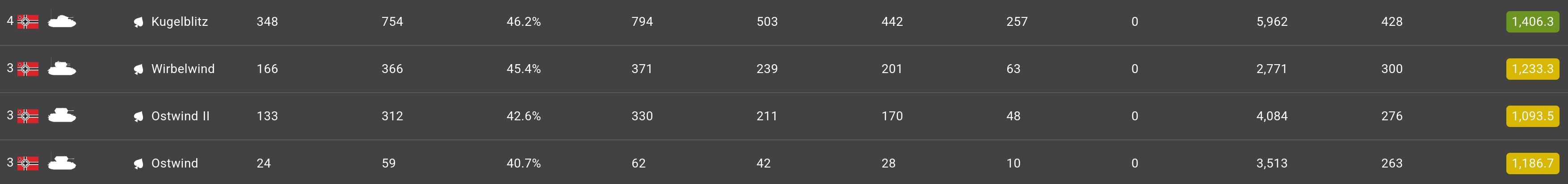 Like my kugel goes to 442/100.6 arround 4.4 KD, while your best is Ostwind at 3.36.