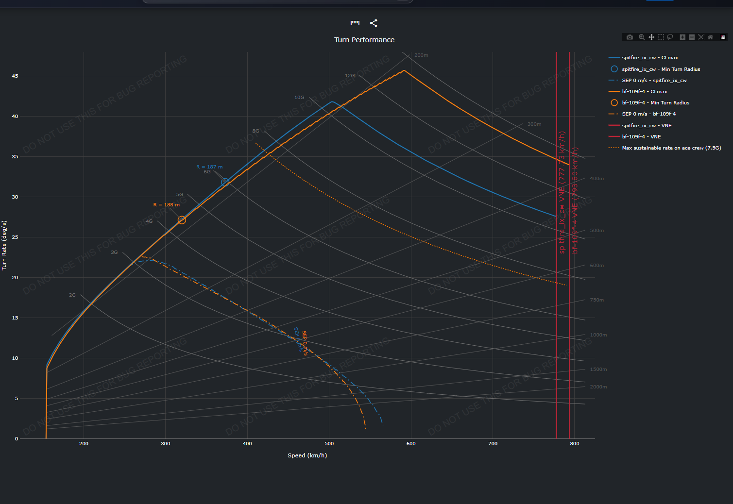 The dotted line tells you where the best sustained turn is in terms of G-loading, IAS, turn radius and we know this is with minfuel and 110% throttle position with AEC.