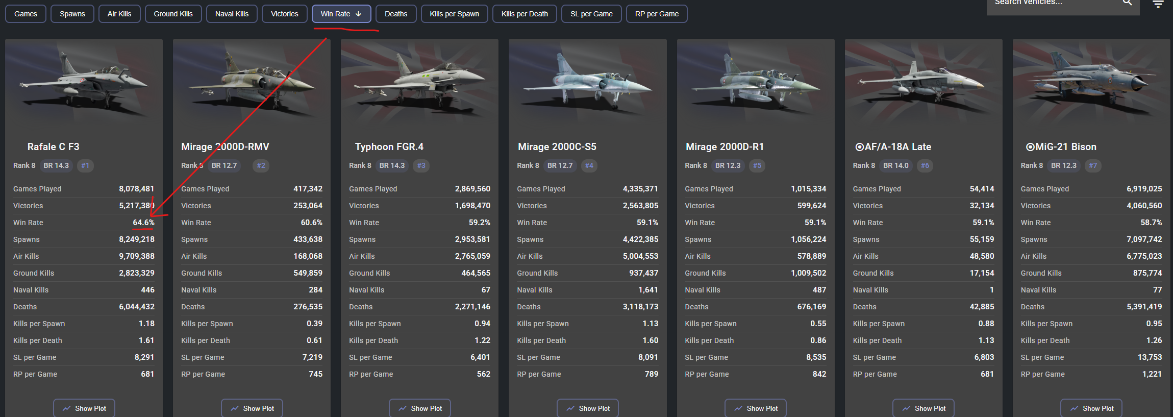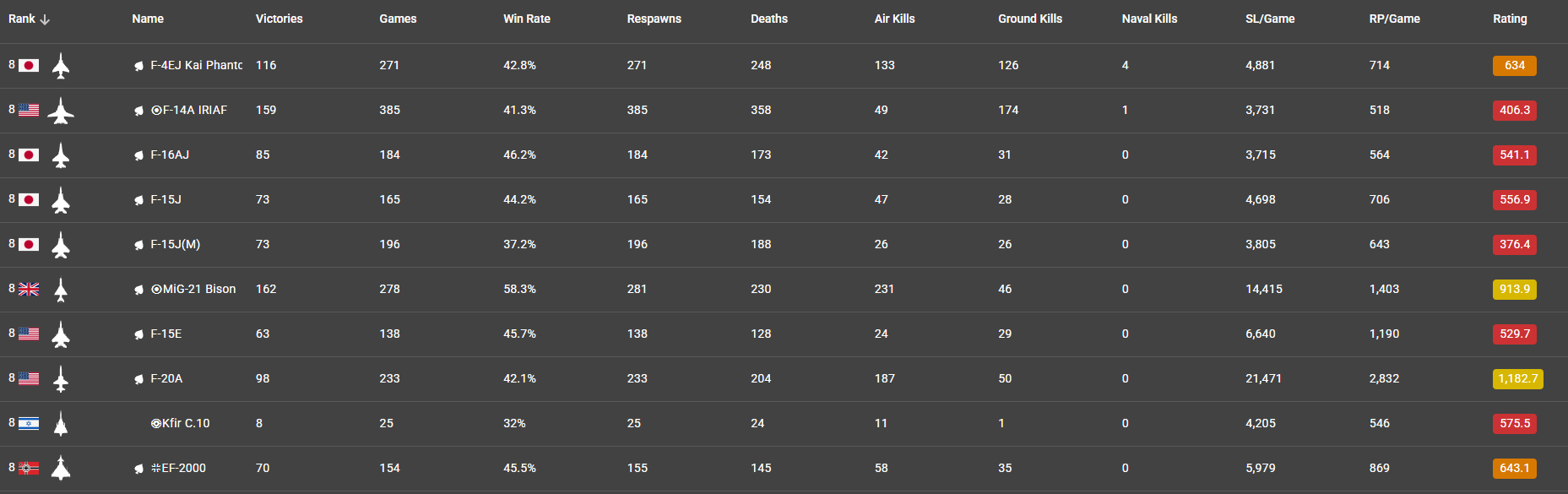Also I vocally am against stat shark usage, but I saw a comment and had to check, why are you giving takes for top tier when you have on average a 0.13 k/d ratio with top tier jets even the Eurofighter which although iffy is still quite good and very affective at guaranteeing at least 2 kills or more per game.