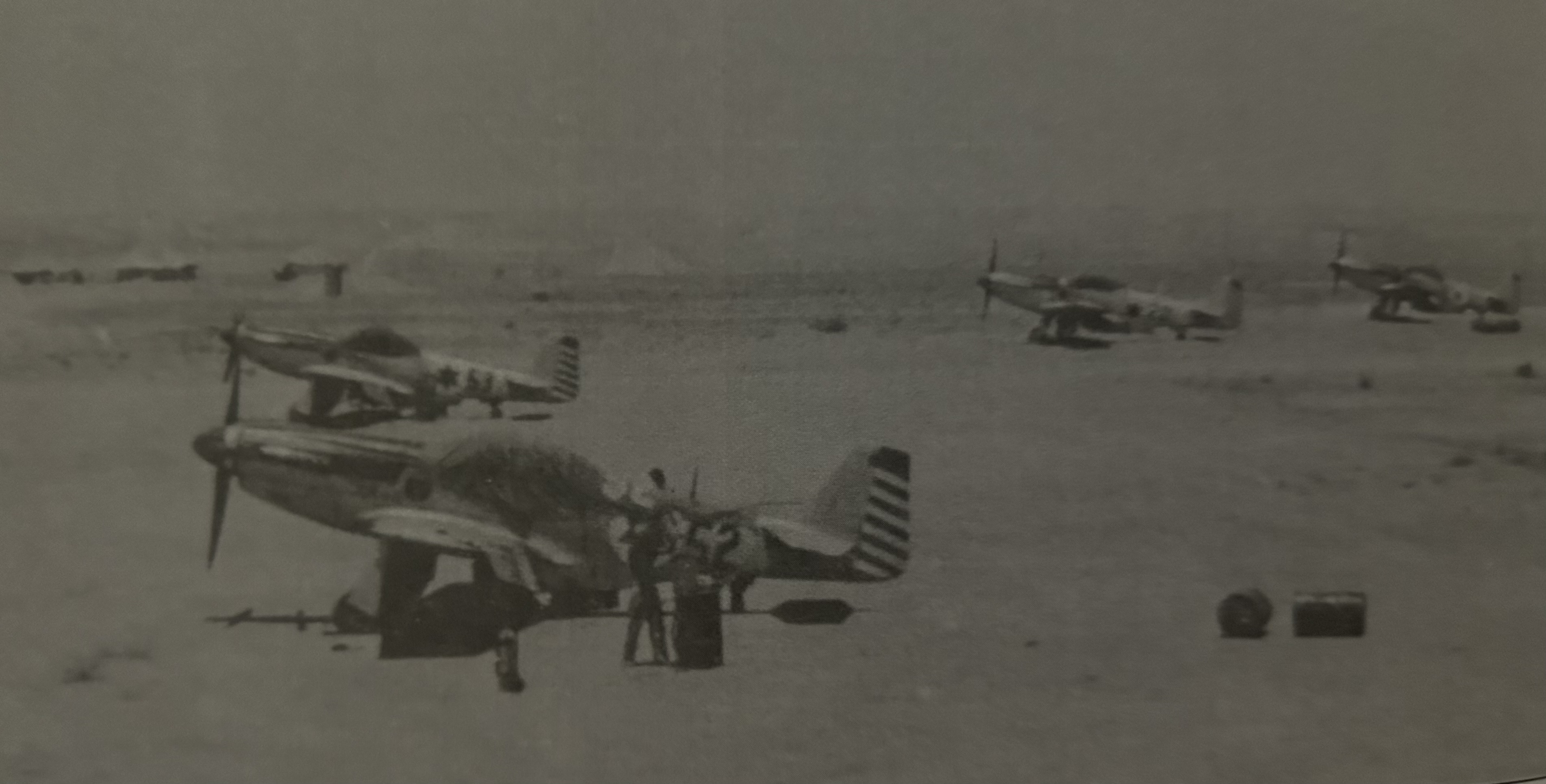 The second batch of Swedish mustangs on their way to Israel, making a stop in the Athens. The nose of a Greek, Royal Hellenic Air Force, SB2C-5 Helldiver is in the foreground.