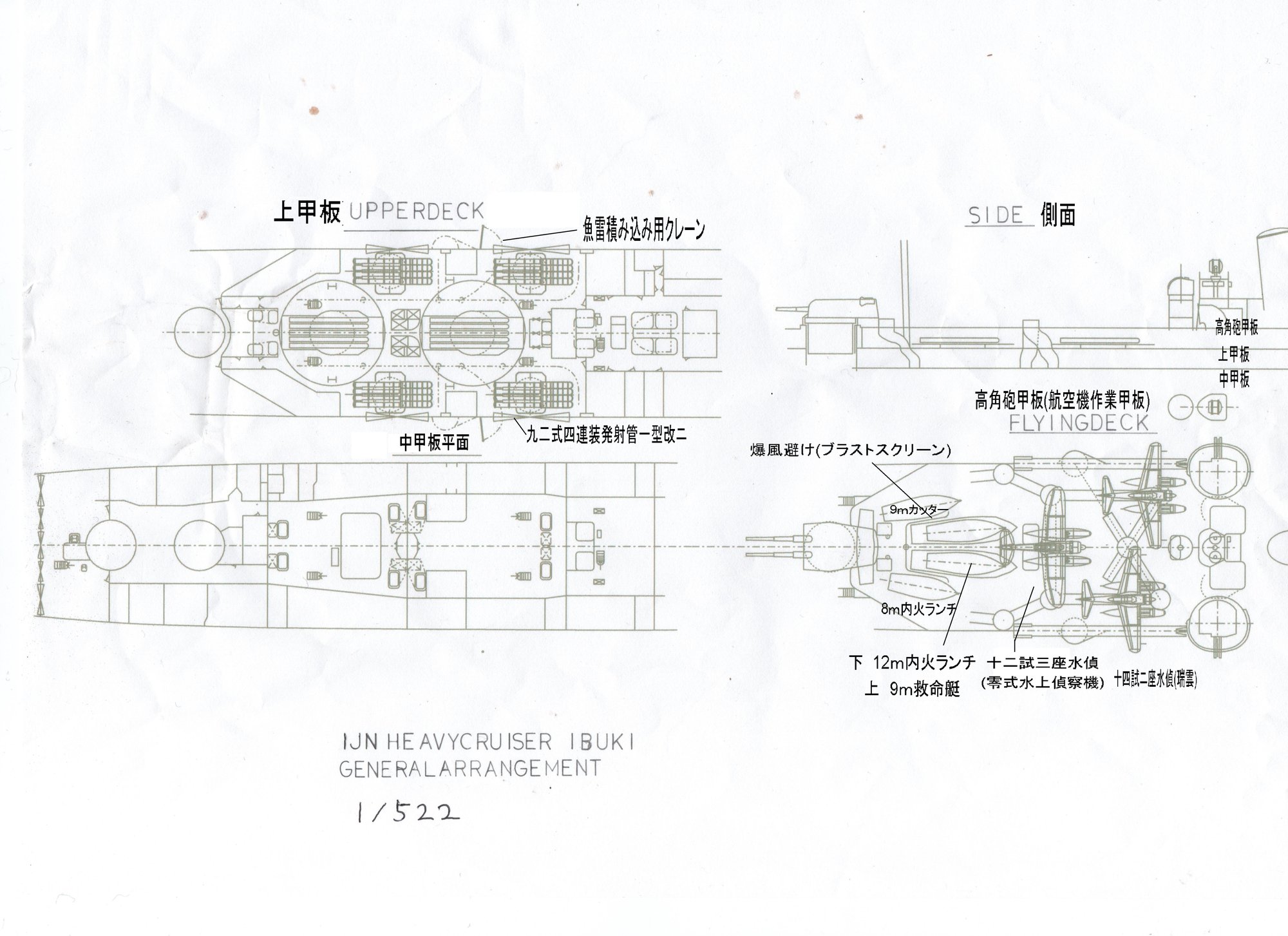 The Ibuki class was planned pair of Heavy cruisers that were designed as improvements over the Mogami Heavy cruiser refit design, the main battery itself would stay the same in terms of gun in the form of primary, secondary, as well as the AA count (Note: if the ships were completed before the war ended the likelihood of the AA count would have undoubtedly increase significantly in terms of 25mm guns) count but the ships were to however in one area of design that change when it came to weaponry is that compared to their predecessors i.e. the Tone and Mogami class ships the Ibuki class would use quad torpedo launchers in the same positions as the Mogami class, additionally one sources seems to indicate that the ships would have used the improved 8" inch gun turrets that were found on the Tone class cruisers.