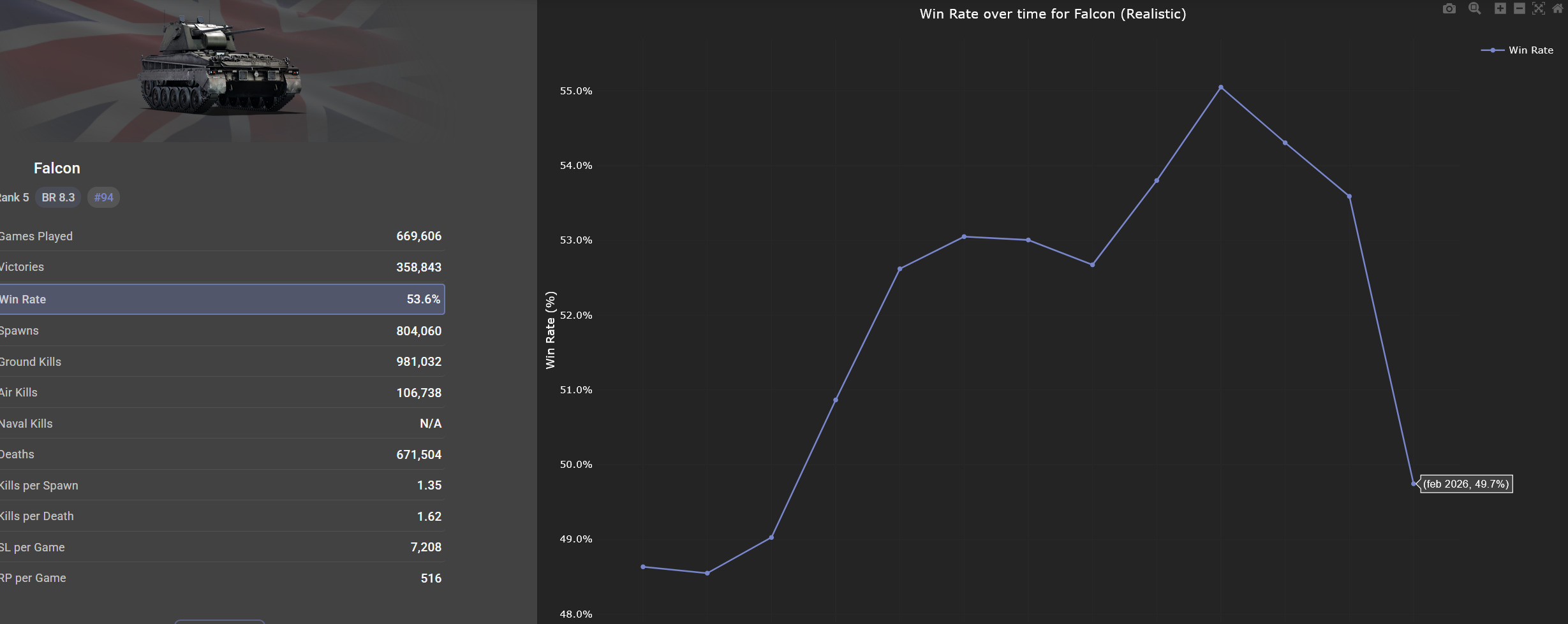 For anyone thinking of saying ‘Smin said the Falcon wasn’t getting moved down even after the APDS removal’, the latest sets of stats have come in for the Falcons performance without the APDS and it has plummeted across the board. While the stats still aren’t awful, if it continues to follow this trend even only for one more month, as players continue to drop the vehicle, then it would end up in consideration for a BR lowering.