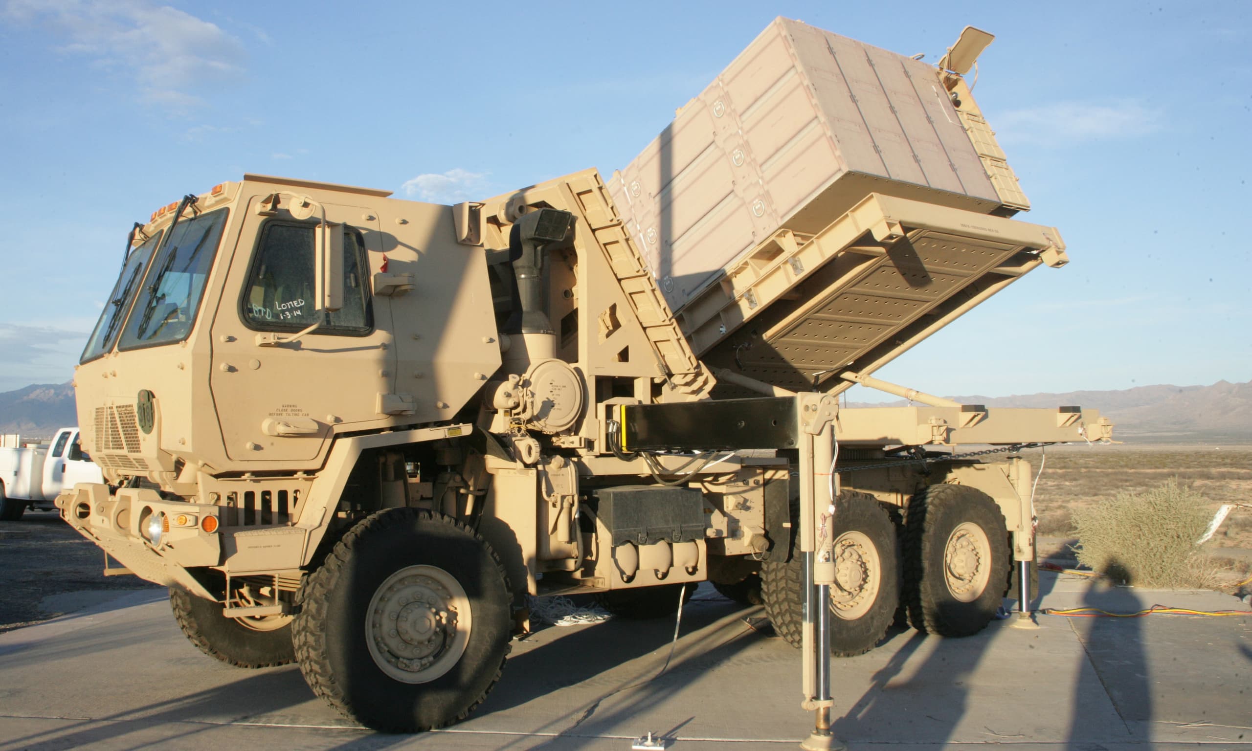 The radar vehicle is modified M1083 5-ton MTV, and the launcher vehicle is modified M1157 10-ton dump truck.