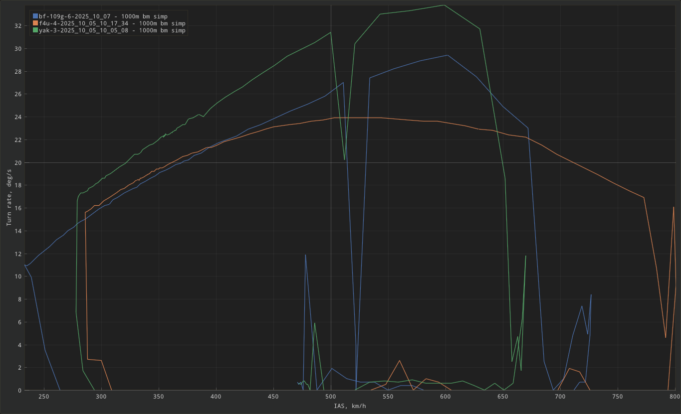 Just like that, we’ve gone from a balanced match-up to one where the Yak-3 is clearly superior across the board. The difference is especially bad for the Corsair which loses its low speed rate advantage AND gets crushed at high speed.
