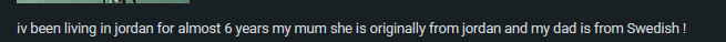 iv been living in jordan for almost 6 years my mum she is originally from jordan and my dad is from Swedish !