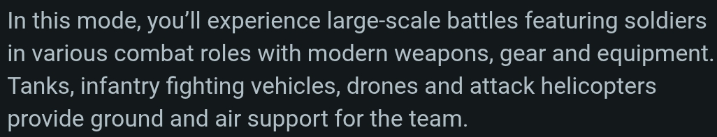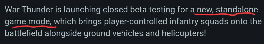 i would love if its a seperate game with its seperate team,i mean look at war thunder right now they’re disregarding most of their players requests,you could see it in last dev q&a,adding more unwanted content to the game would make them scatter their focus on multiple parts of the game instead of fixing everything at once,we’ve had capture the point for 10 years,plus i dont want war thunder to shift from vehicle realistic game to squad or arma clone when millions of people wasted their money on VEHICLES and not hoomans with ar’s and drones…i really hope its a seperate game