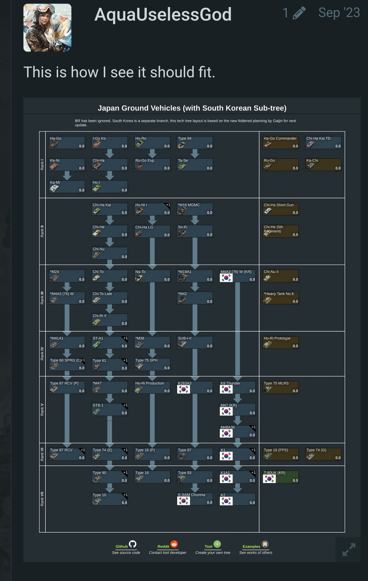 Regarding giving Singapore to China: A disastrous move. If you cared about your game (which I am really doubting at this point), you would be providing China with the hundreds of fascinating domestic vehicles they have, rather than seeking to fill their ranks with vehicles that are so far removed from them it is almost comedic. China has enough to fill five lines on their own WITHOUT a sub-tree, and if you really needed one, you already have Pakistan, Bangladesh, and North Korea primed to take that position, all of whom have much deeper connections to China. Singapore should be put in an ASEAN tech tree in a perfect world, or at worst, Japan (or maybe as a sub-tree to like, Indonesia or Unified Korea idk).