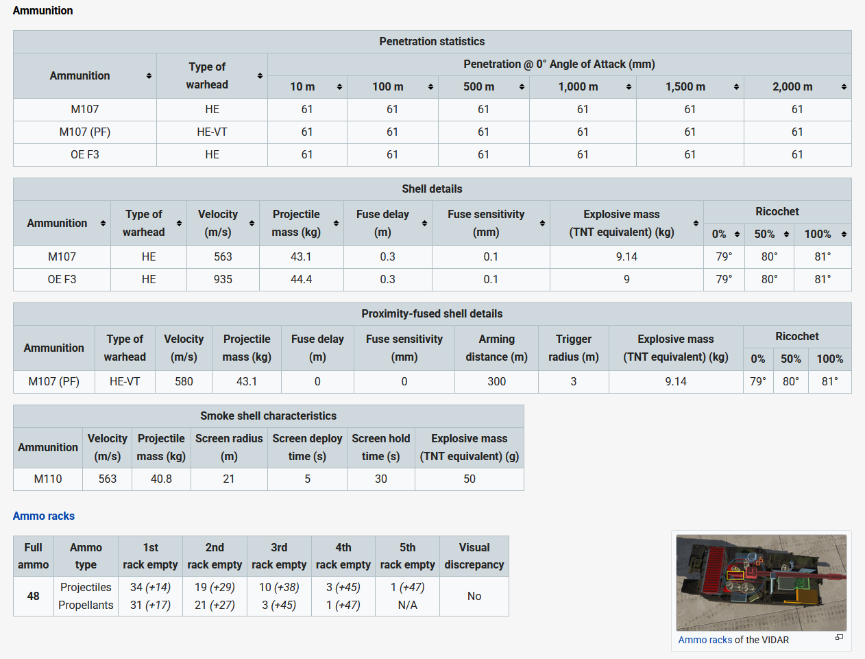 From a quick glance of the new wiki, you would not be able to tell, that OF F3 is a better round than M107, because of its velocity, and therefore a player that just bought the vehicle, and looked it up on the wiki, might not have realised that they should be using OF F3 over M107.