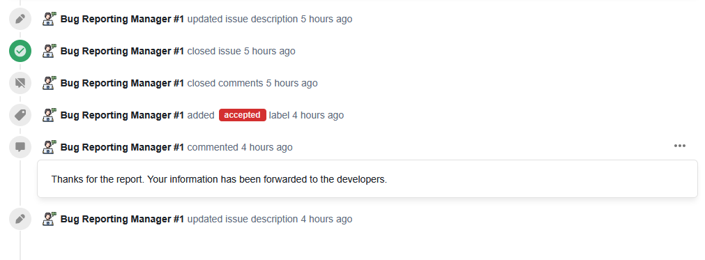 What’s with this chain? Updated → closed issue → closed comments (they’re still open?) → accepted → commented → updated again. Did the commenting of the manager automatically open the comments again?