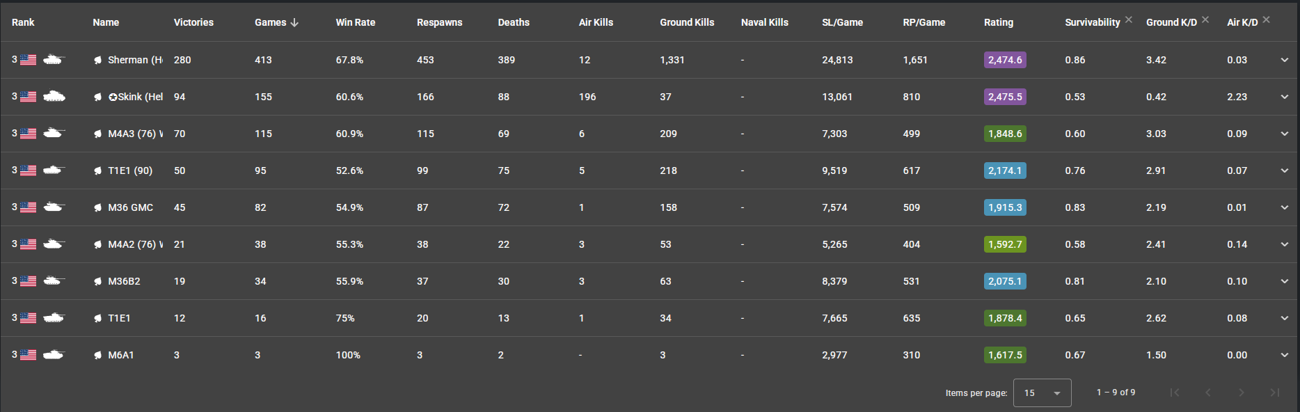 Above are all my recorded sessions with the US 5.7 lineup from the day Ive got Sherman (Hell) till today. I have 67.8% winrate as well as average KD of 3.42 on my Sherman (Hell). I have 413 games total with it, with 453 respawns and 389 deaths.