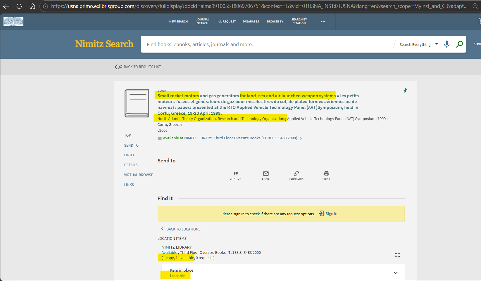 You can see here that this library, the US Naval Academy Library has a book available that was published by NATO and is regarding small rocket motors for missiles that are launched by land, sea, and air, and is loanable.