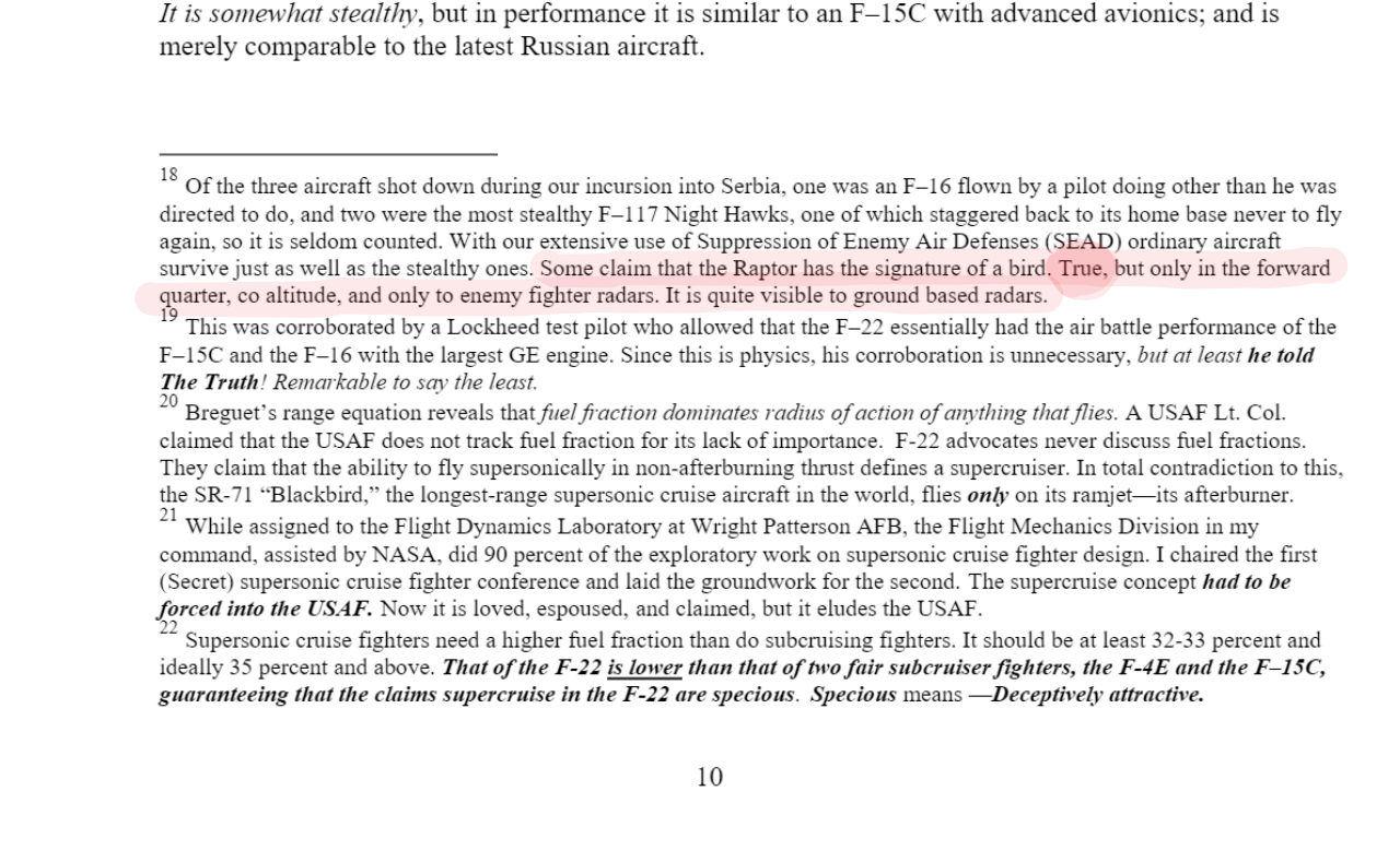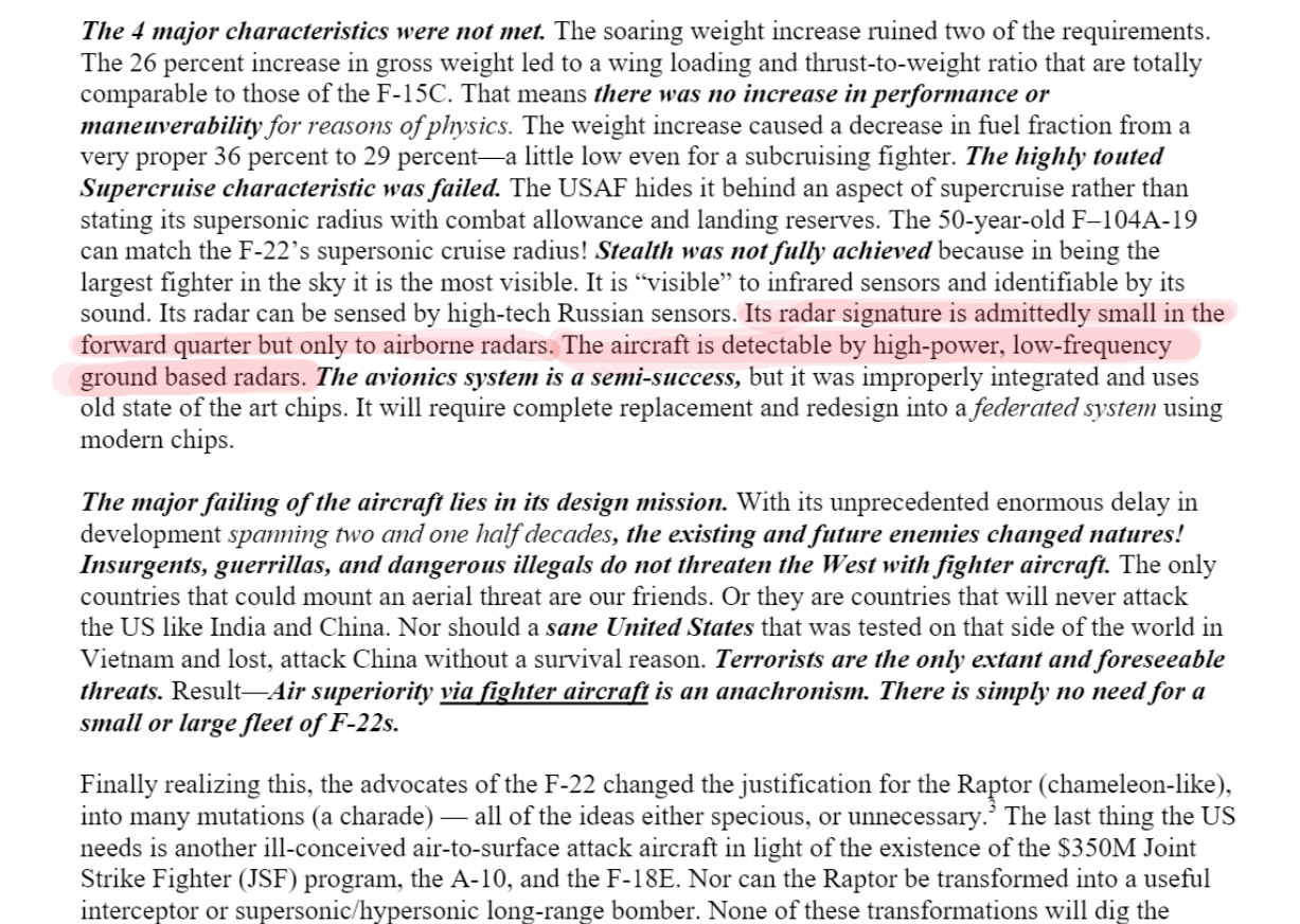 While I do think he exaggerated on some points (i.e. F22 not being more maneuverable than a F15C), he was correct on others: weight requirements on the ATF were unachievable (the ATF requirement of a short take off was cut off, even without the extra weight from the reverse thrusters), price per plane at 35M was absolutely ludicrous (what’s the most recent figure again? 350M?), there was not really a need considering the geopolitical scenario (popped a balloon, so far), the F22’s software & hardware is hard to upgrade because everything is too tightly nested together instead of being a modular design, that it wouldn’t make sense to spend more to create a CAS or a bomber version that would end up with less payload than what already existed.