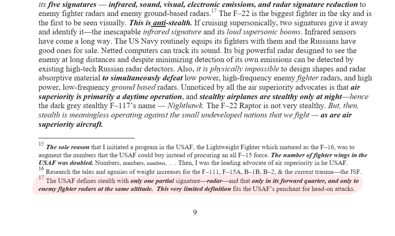 His criticism on many aspects of the ATF program is well founded, and he had insider info we do not - remember he also worked for Northrop beside the USAF.