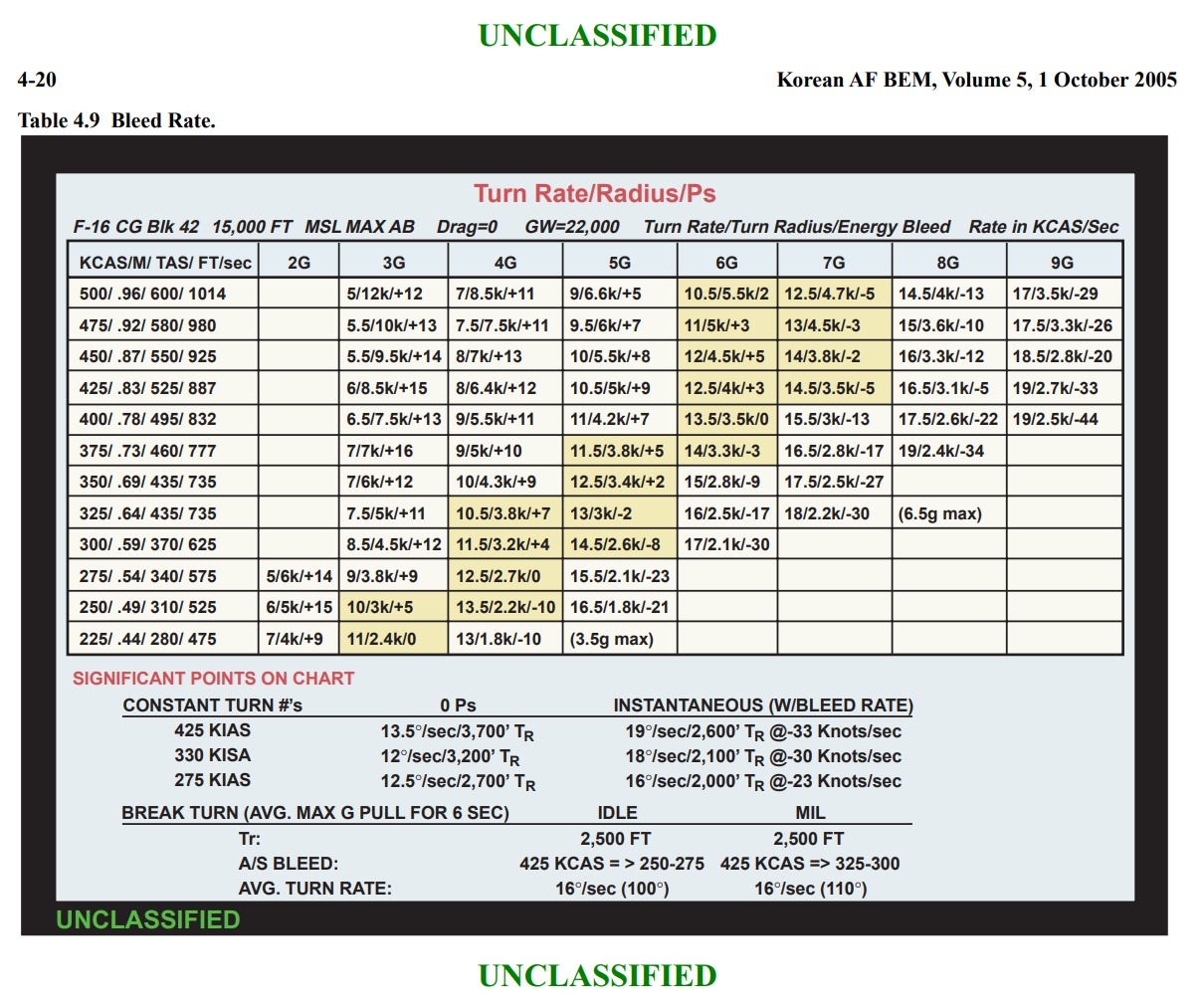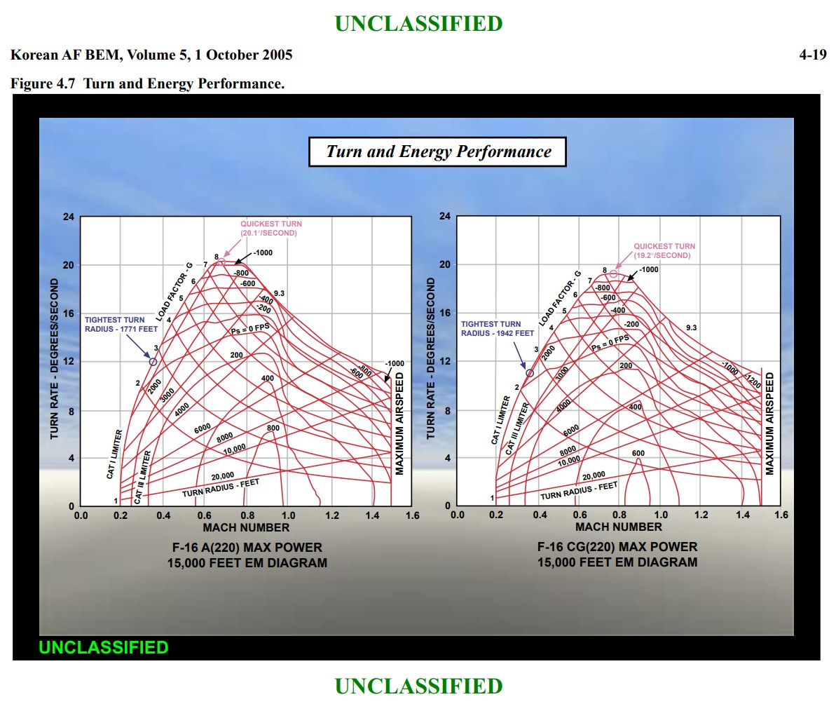 Comparing this chart to the Su-27 turn rate chart shows the F-16 having a superior turn rate by about 1/2-3/4 degrees per second.