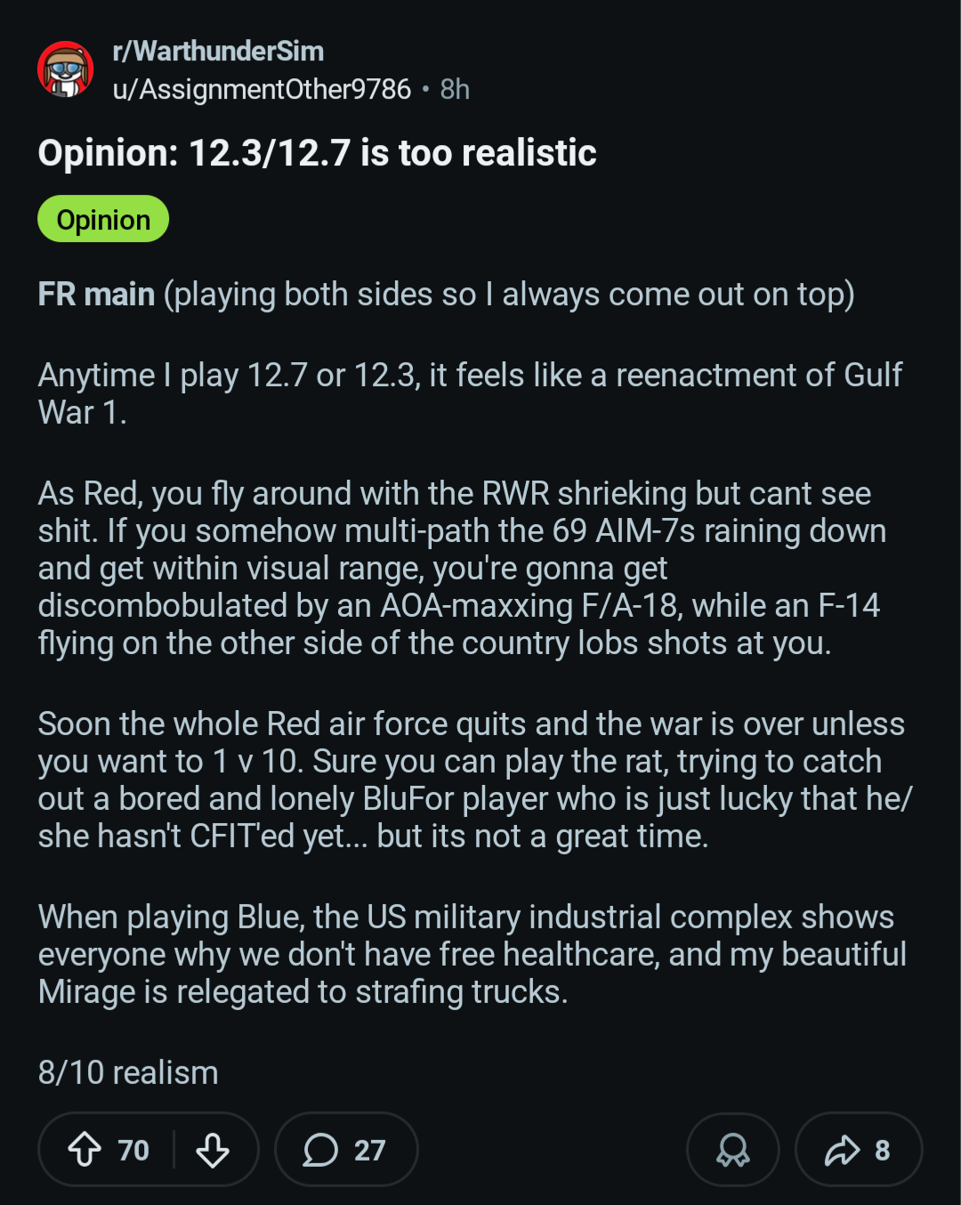 That’s why you keep sim and fix it. But I do like the idea of a shorter Air Sim battle with ARB controls and no names over people’s heads.