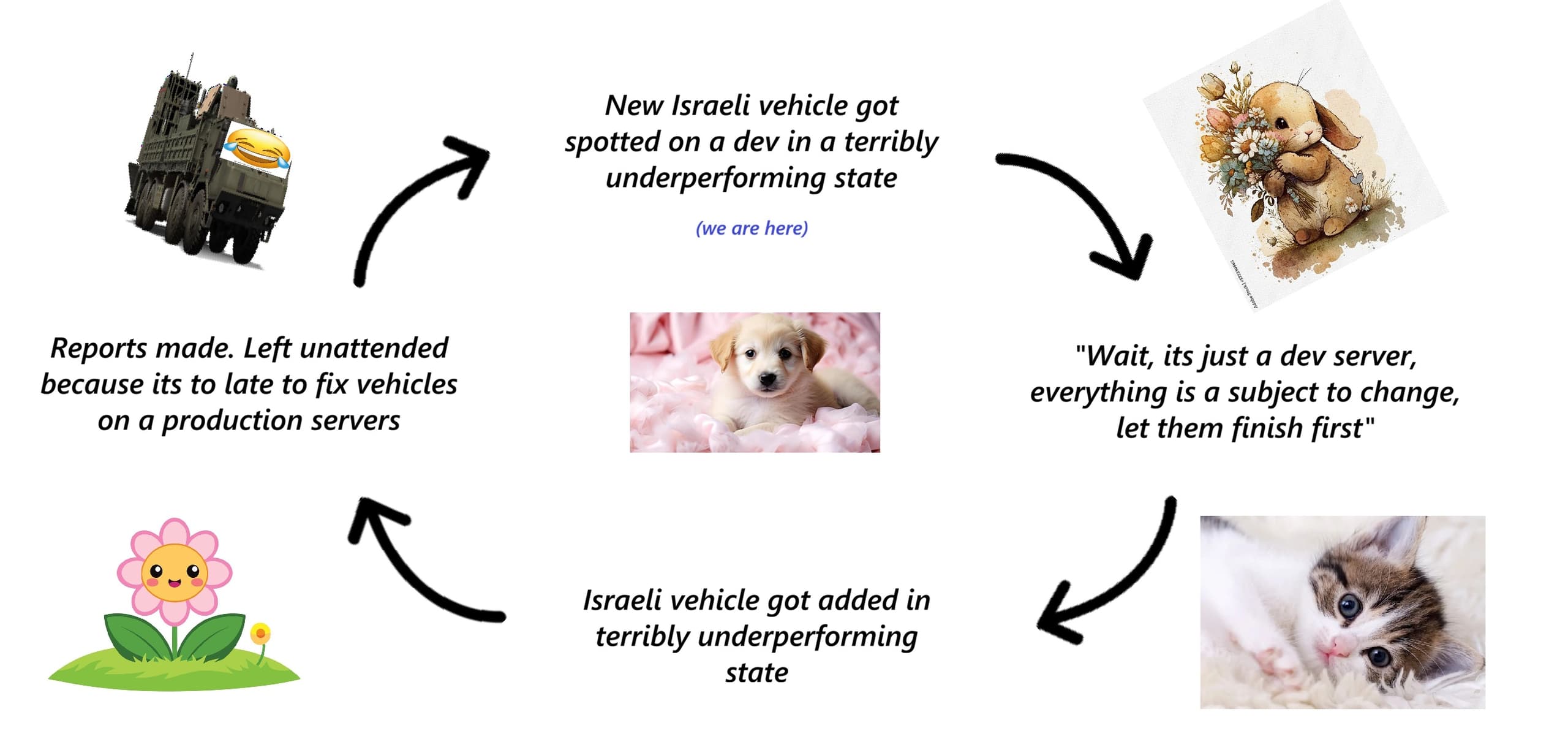 Needs another thing added, that being the devs nerf an unrelated Israeli vehicle while reports wait.