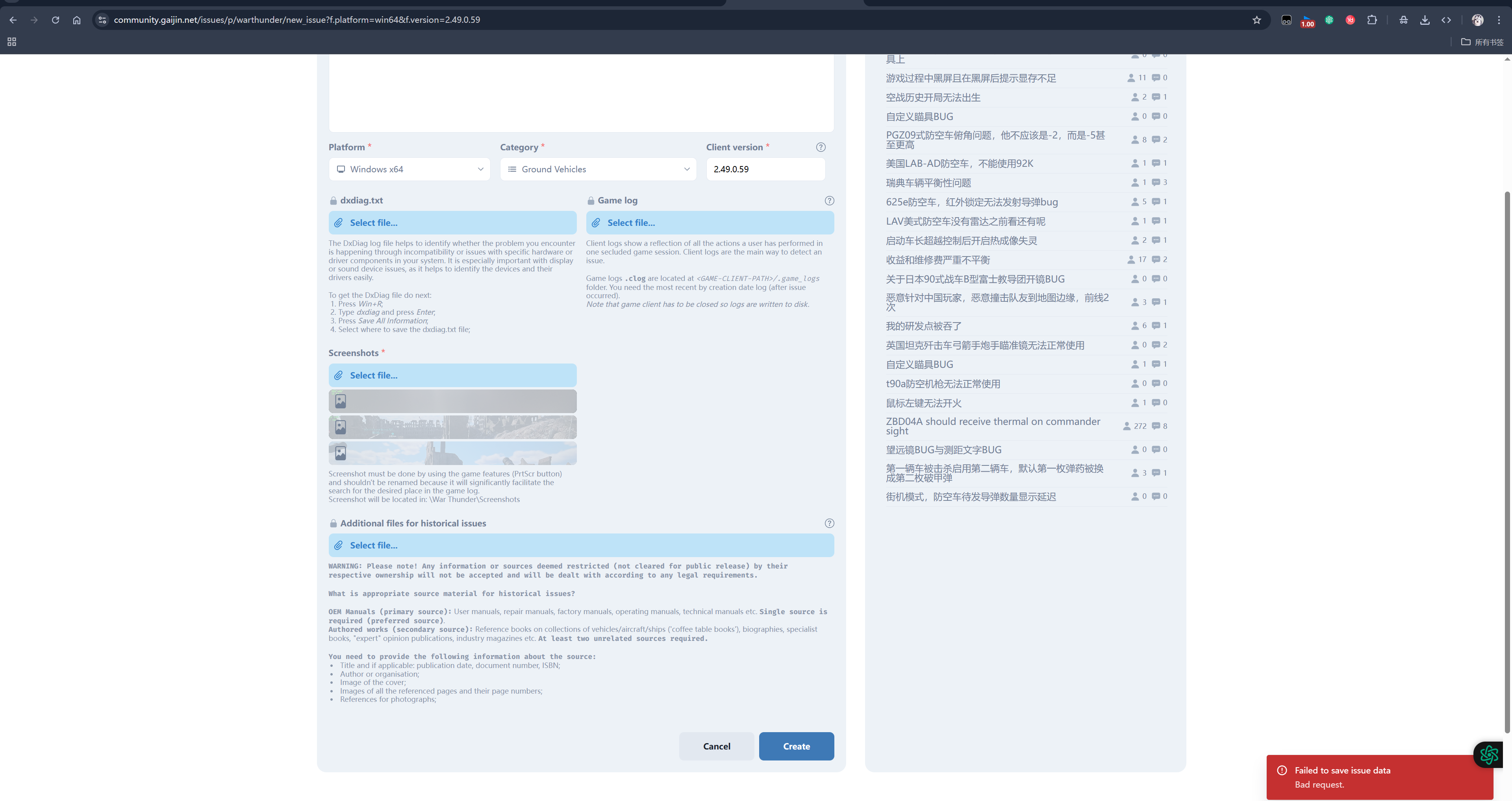 我提交issue的时候怎么一直显示 Failed to save issue data Bad request. 无法提交