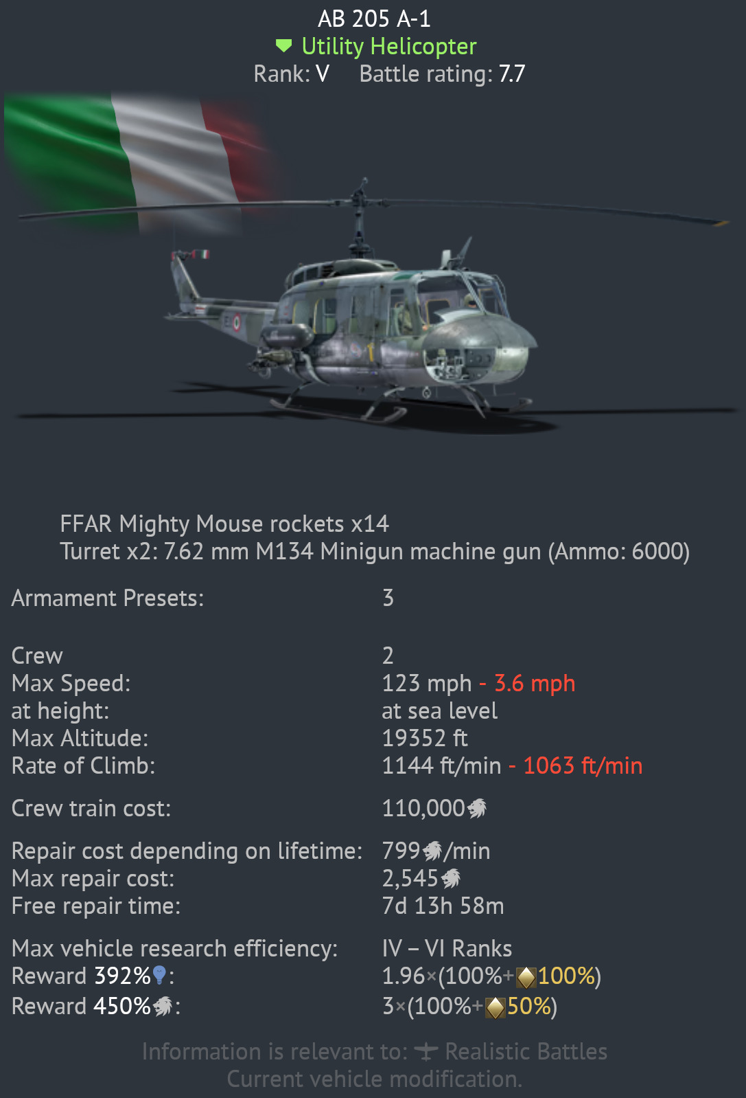 This vehicle sits at 8.7 which wouldn’t make it an unreasonably high BR for a starting helicopter, Important to note I only chose this one over the MI-24D because its Italian, and I thought it make more sense for your first Italian Helicopter to actually be Italian it would just sit before the MI-24D Instead of after it.
