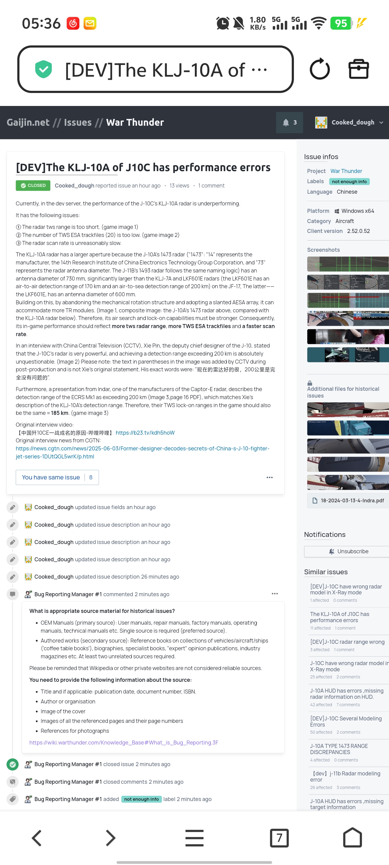 The TWS trackfile capacity of the KLJ-10A in the game is also set too low. It’s only 20, while other top-tier AESA radars are set at 40. This includes the Typhoon, Rafale, F-15C GE, and F/A-18E mentioned above – all of their TWS trackfile capacities are 40.