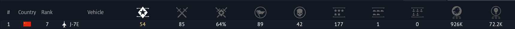 I really meant Mirage F1C, but you seem to have a very different view of how engagements happen, I think of it as Mig23MLD for example take 2 chances (R24 and then full aspect R60M) before J7E fights back and the chance of getting kills are near equal, since PL5B will happily eat flares up to 10km away. Same happens with F4SII which has up to 10km engagement capability and J7E will have to fly through the first wave of missile or just get killed after 1. PL5B is not really supposed to be used in a dogfight, I do see u have 100+ games in it and so do I but as of RN I think even in the current stupid IRIAF spam I would still rather J8B.