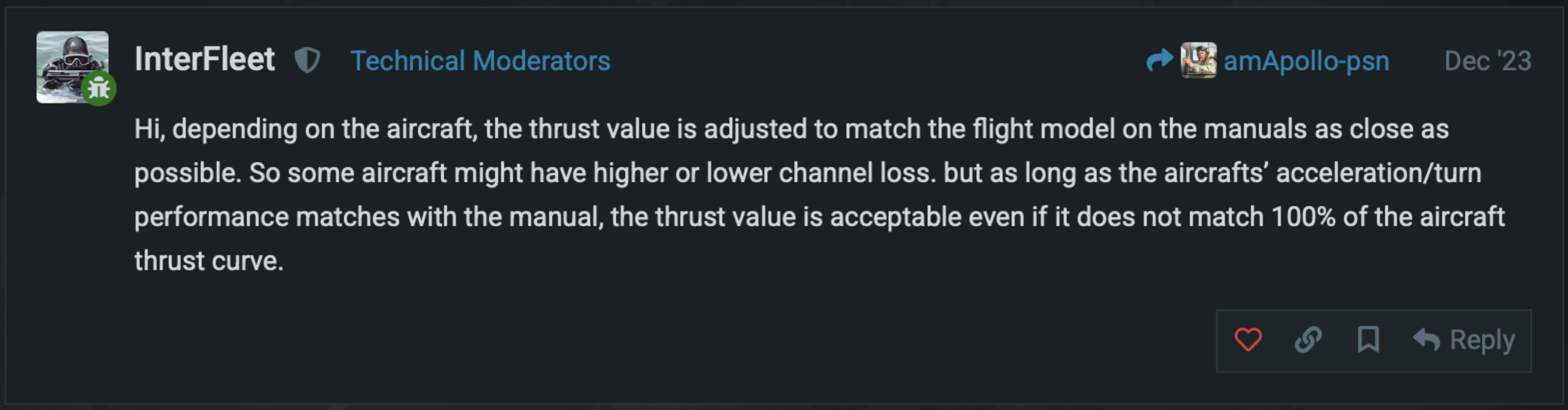 They just use channel loss as a tool to adjust things, nerf thrust and they’ll just compensate buffing the drag. I doubt they’re interested in changing the entire FM just so it shows slightly more accurate thrust in-game… Have there ever been a bug report that adjusted channel loss in-game?